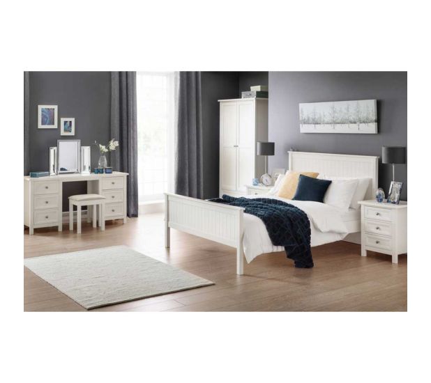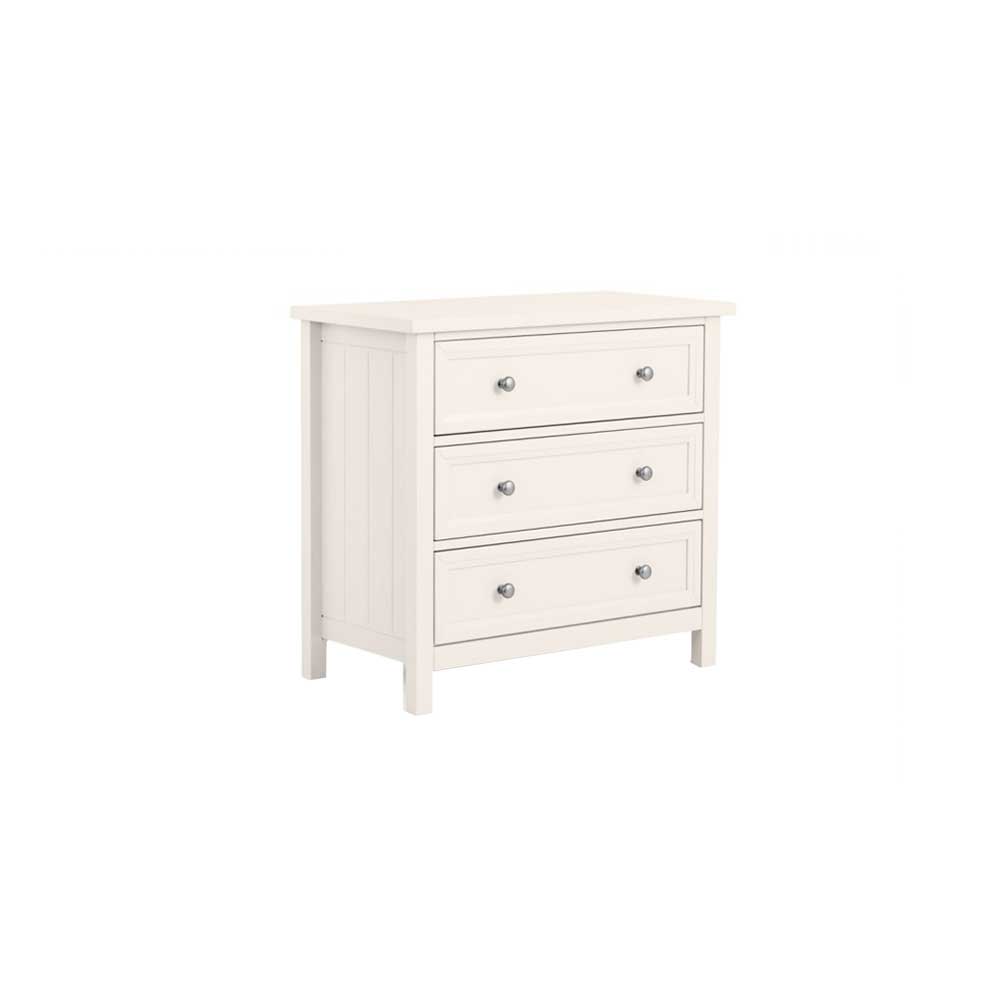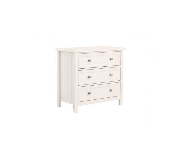 New England is an elegant style range of bedroom furniture. The combination of exquisite surf white lacquered finish with characteristic side panelling and detailed chamfered cabinetry makes for a soothing and refined aesthetic with timeless appeal, while delicate pewter handles add the perfect finishing touch. The New England 3 drawer chest offers three large storage drawers.