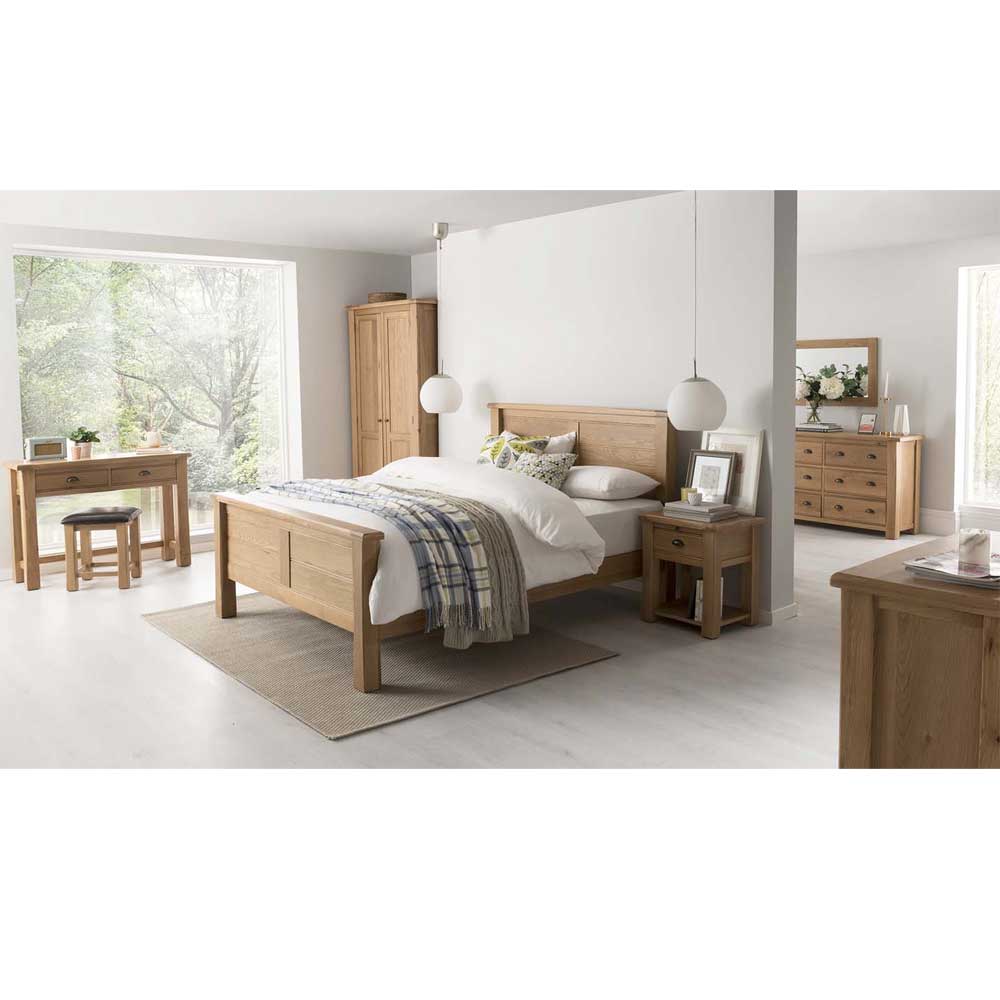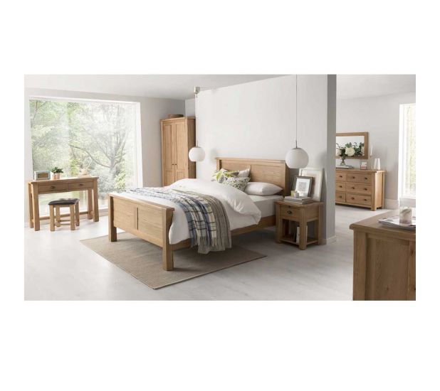 Made from beautiful white oak and veneer, the Bree collection is treated with an oil and lustre finish which brings out a contrast in the beautiful oak grain. A groove panelled element is carried through all pieces and chests, elegantly finished with bronze handles and tables feature metal close runners.