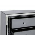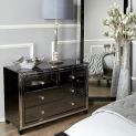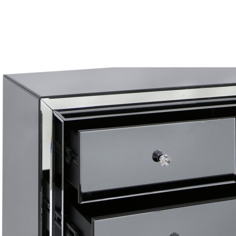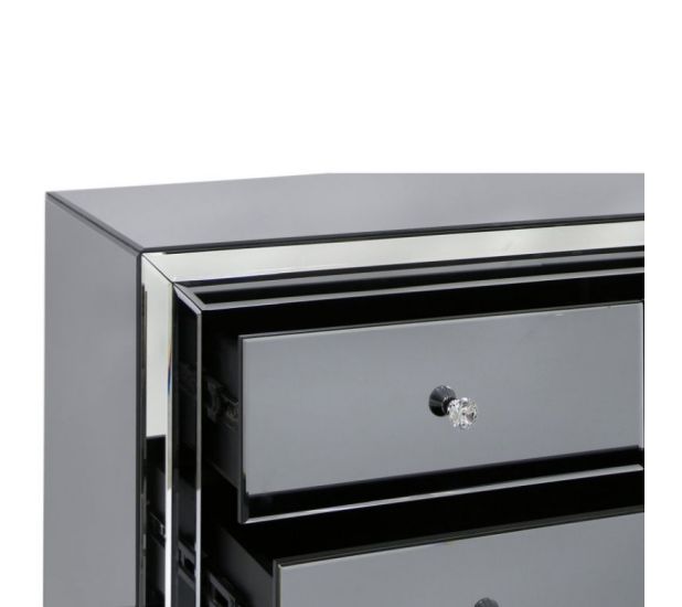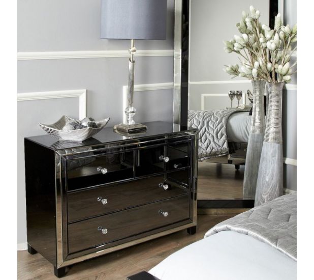 Chic and contemporary, this Omnese Collection is crafted in wood with grey glass panels throughout, clear mirror edges and Crystal handles. The collection will bring a touch of glamour to any bedroom.