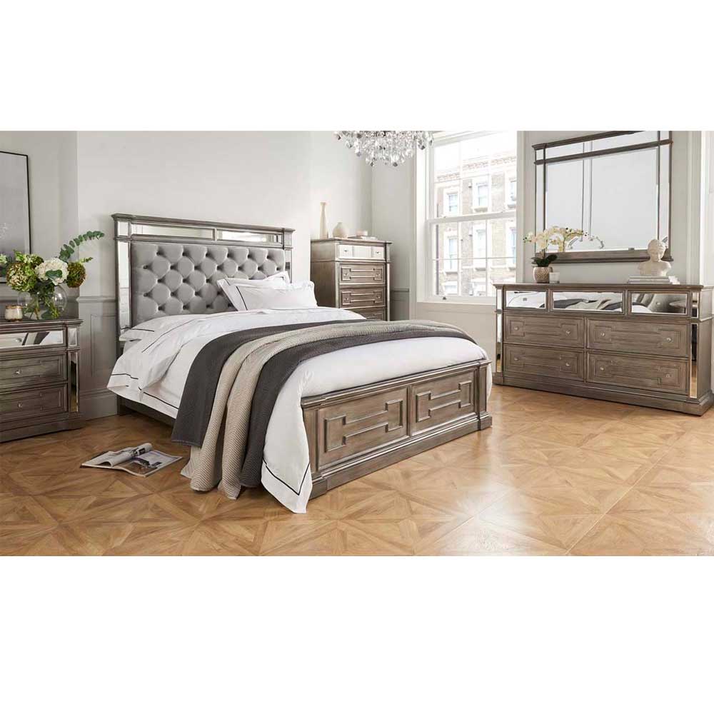 The Ophel collection has been designed for those who seek an elegant yet modern bedroom. Units feature beveled mirror panels and crystal-styled handles set against a contemporary grey coloured frame - this Hollywood regency glamour-styled range has it all. Ophel also features large drawers with detailed paneling that will work with many interiors.