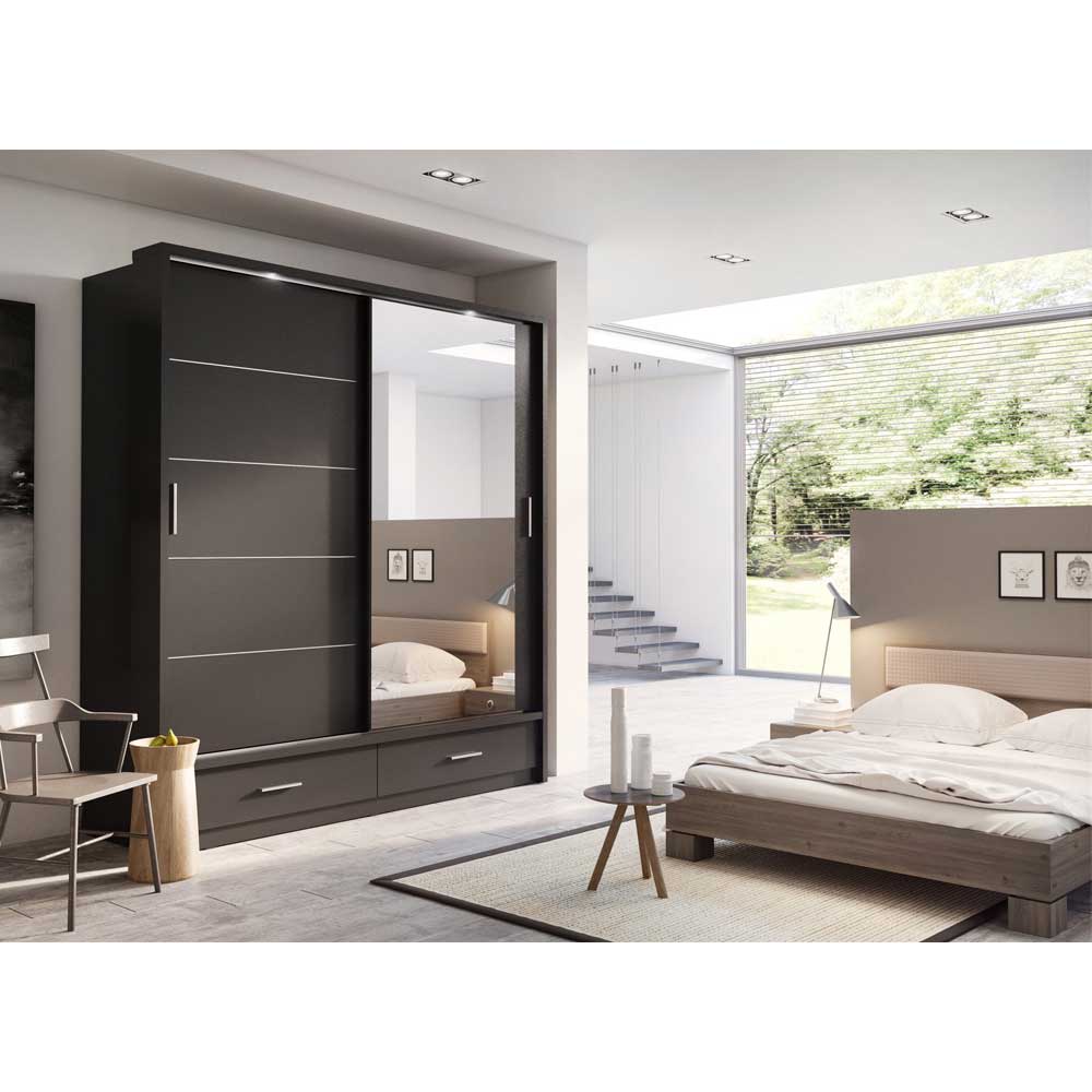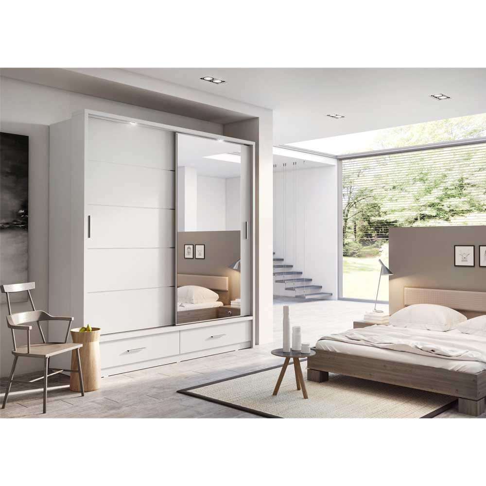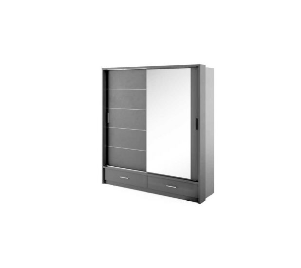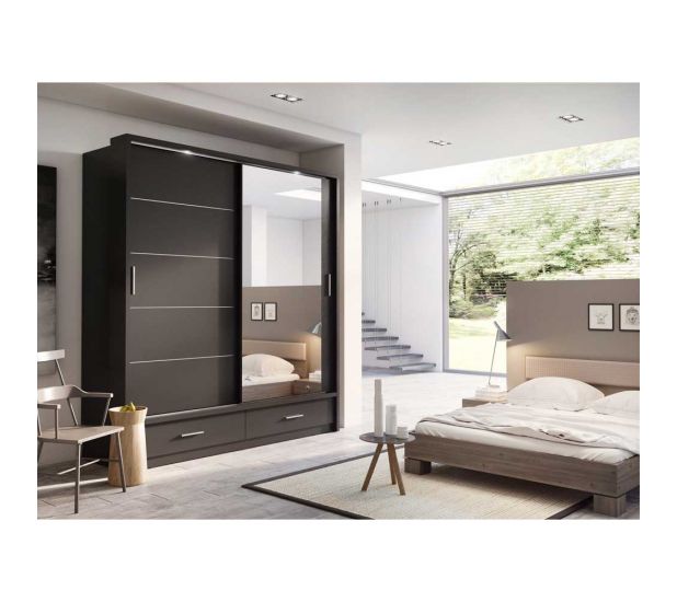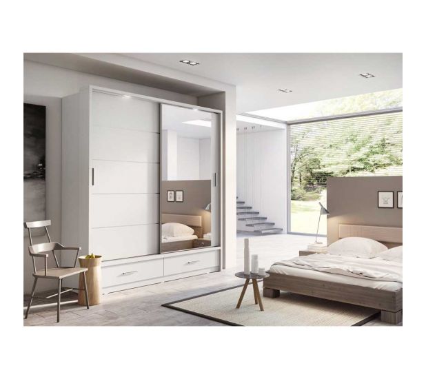 The stylish simple design is the perfect storage solution for your modern home requirements. This is our most popular design due to extra drawers. This wardrobe is made of a 16mm high-quality laminated board and front with shiny silver coloured plastic handles for that modern look that will match most colour palettes with a large mirror that will visually enlarge your bedroom.