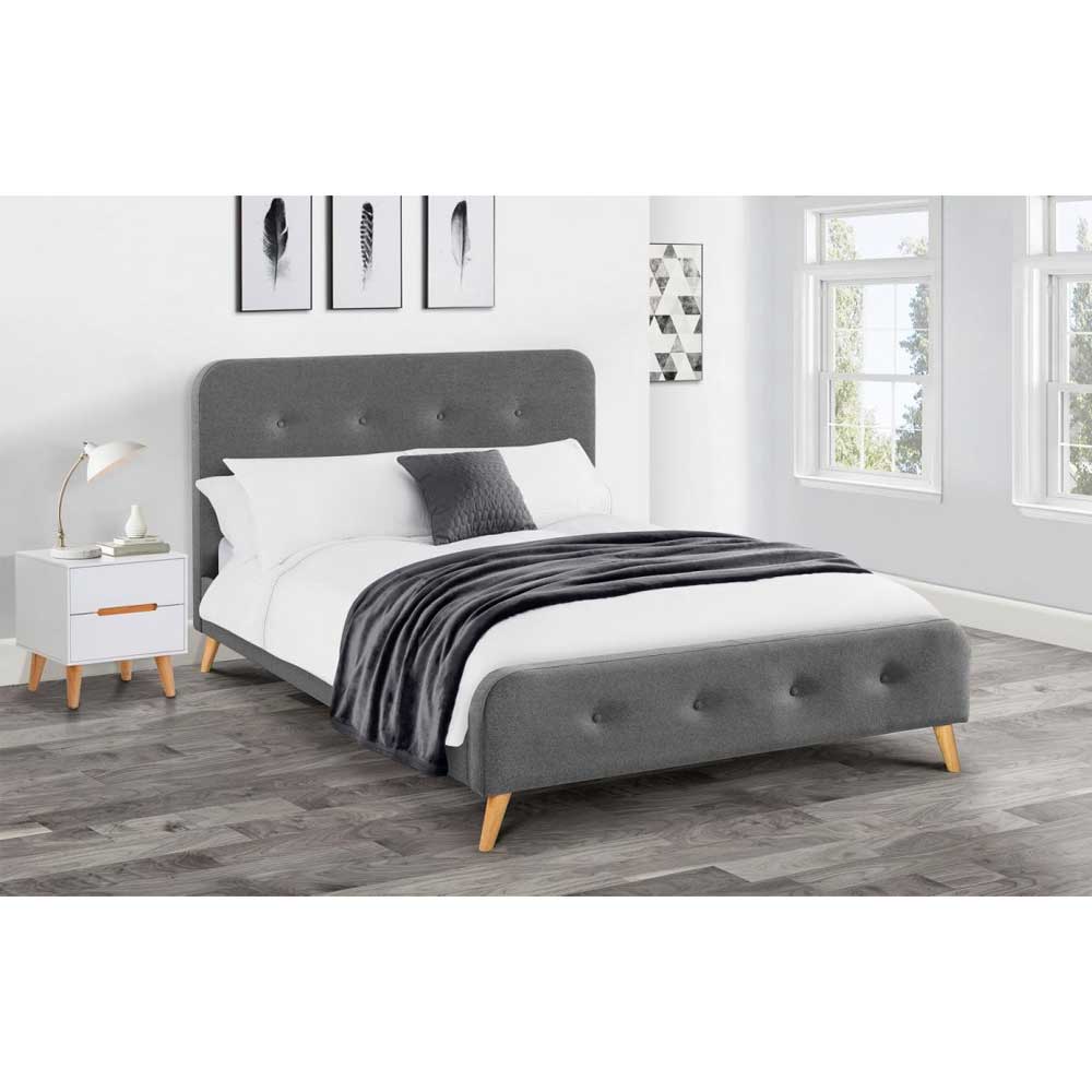 The Astri fabric bed combines classic Scandinavian design with contemporary light oak splayed legs for a timeless style. Beautifully upholseterd in a crisp grey linen with a neatly buttoned headboard, Astri's clean lines sit well with any contemporary decor. The robust construction incorporates a sprung-slatted base to ensure a comfortable night's sleep and prolonged mattress life.