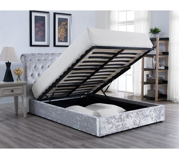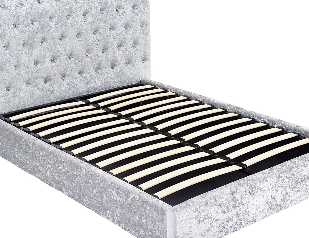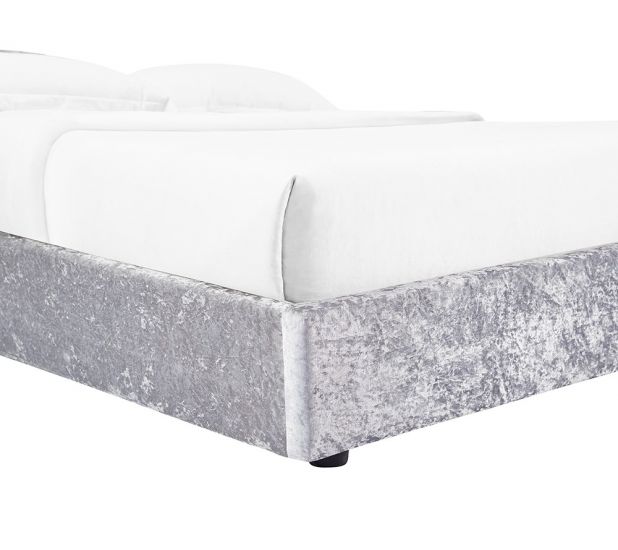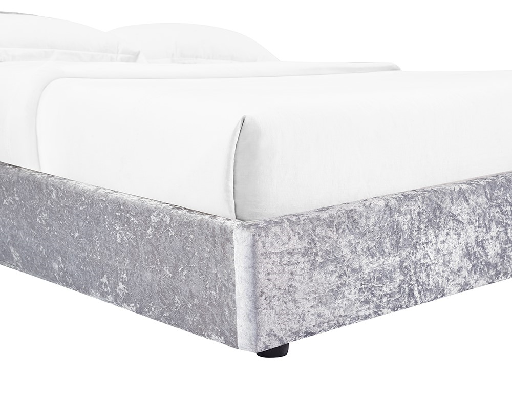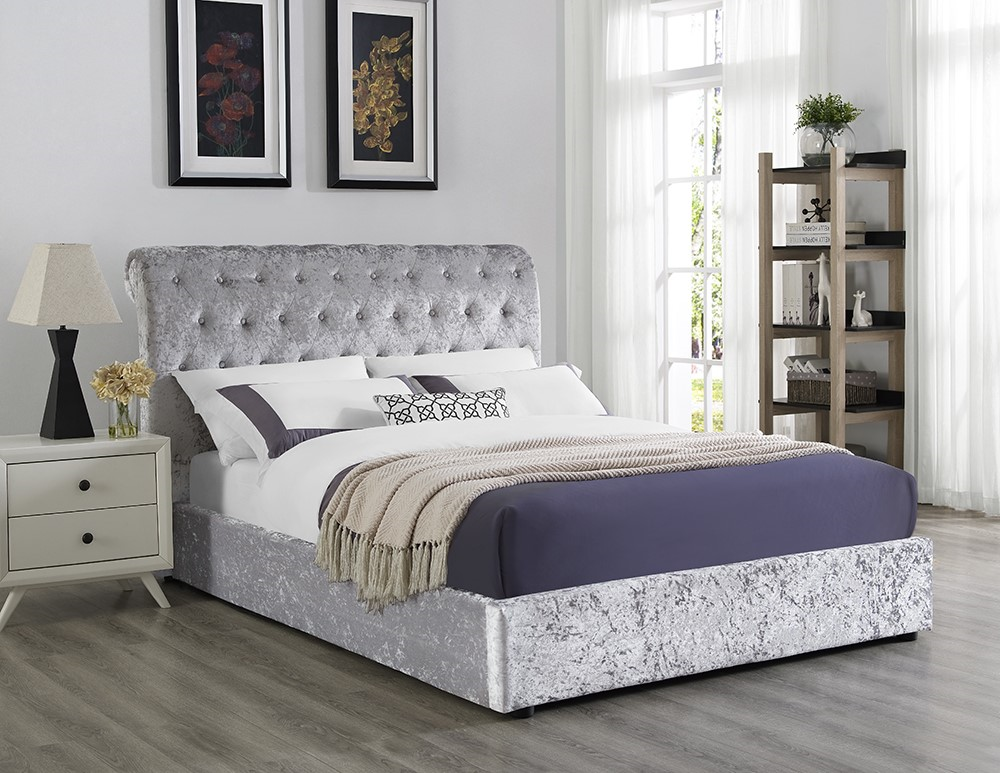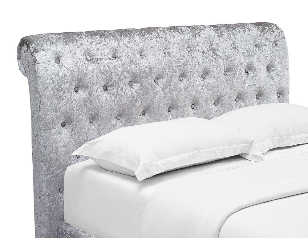 Upholstered in ultra soft crushed velvet, this gorgeous bed will make a statement in your room with a low footend and high rolled headboard featuring classic tufted button detailing. The beautiful silver grey shade will complement a range of interior colour schemes.