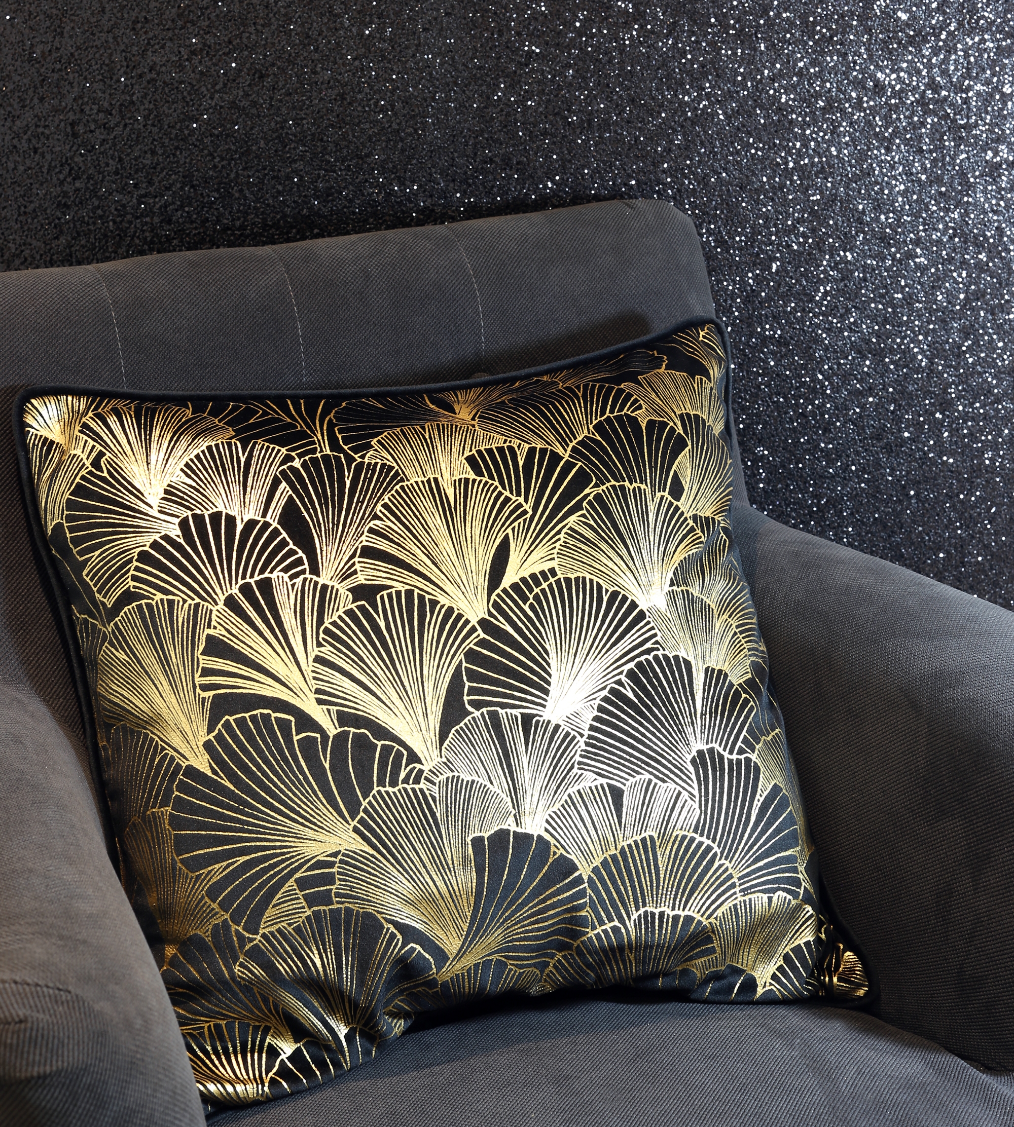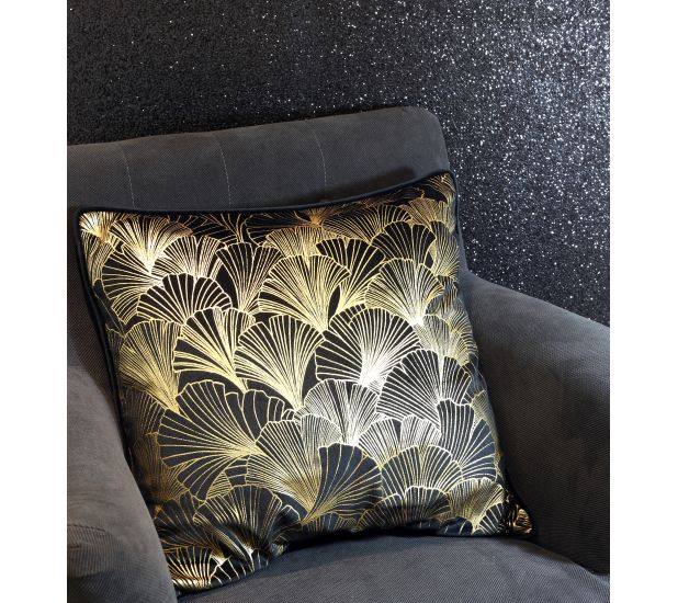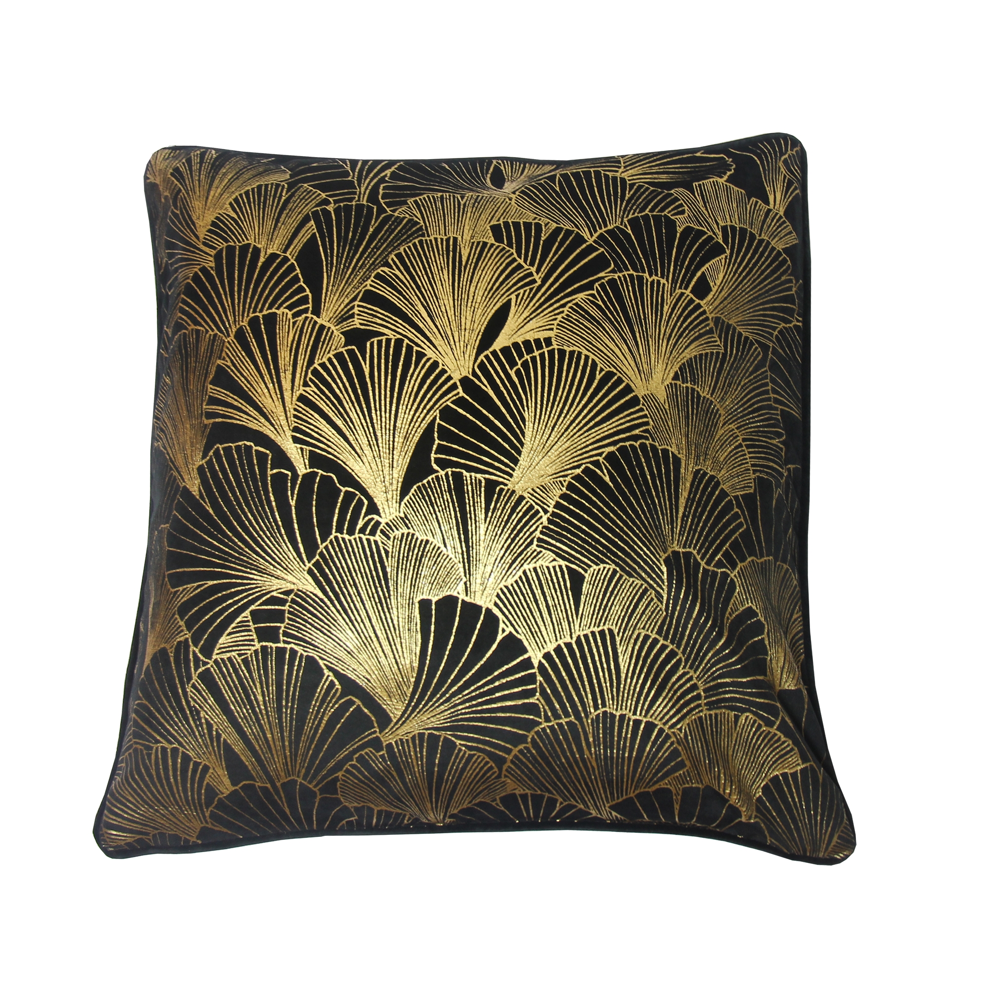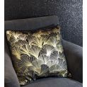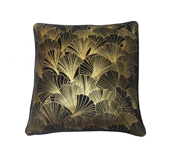 This black soft velvet effect cushion shows a beautifully detailed gold foil gingko design that will bring an elegant art décor touch to your room. Cushion pad is included.