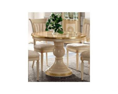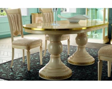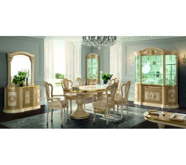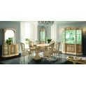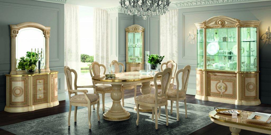 A timeless classic and luxurious collection manufactured in Italy by Camel group. Aida dining room features high quality gloss finish in cream and gold shades, the baroque style and classic lines combine to create an environment that evokes the splendor of the 1600 palaces. Gold details on ivory high gloss panels and arabesque decorations with Art-Deco handles make this room an obvious choice for those who love classic timeless atmosphere.