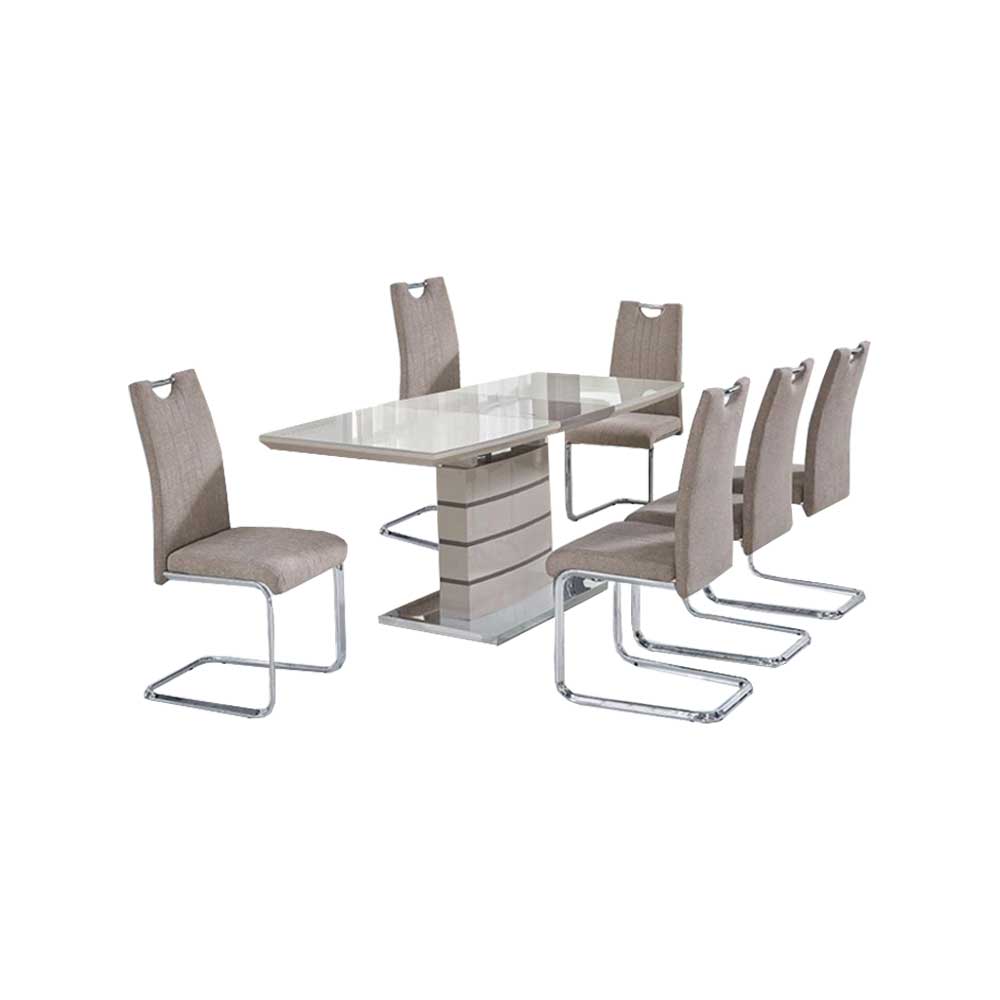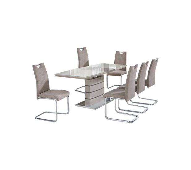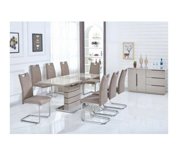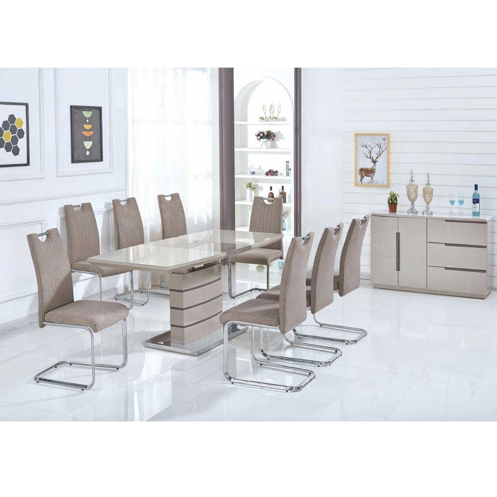 Modern Extending High Gloss with Tempered Glass Top and Stainless Steel Base Cappuccino & Champagne. This contemporary dining set is perfect for smaller and bigger families.