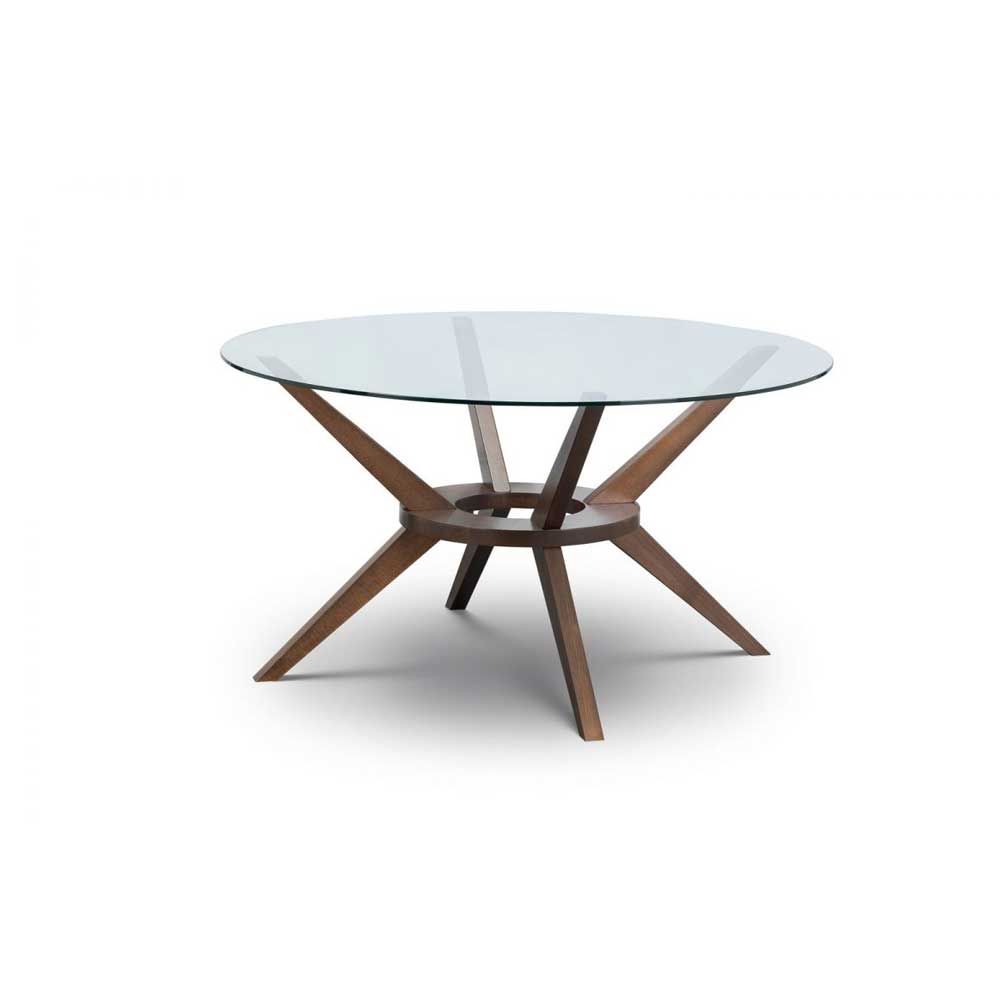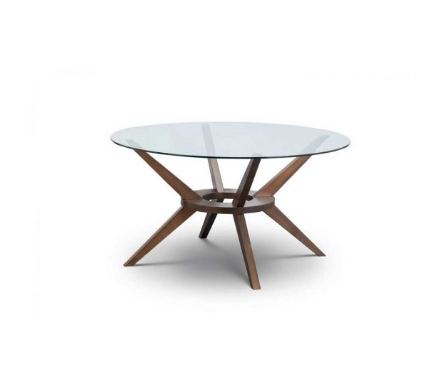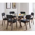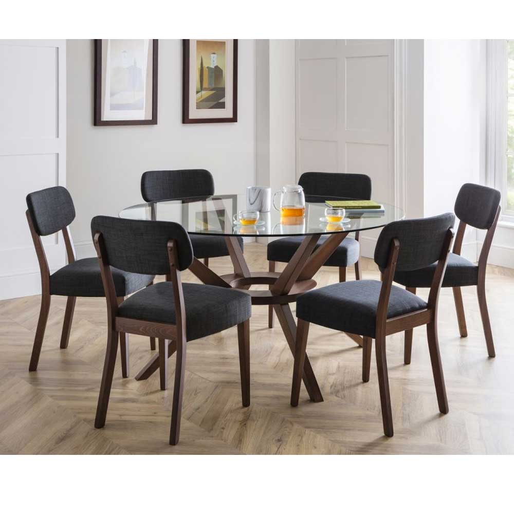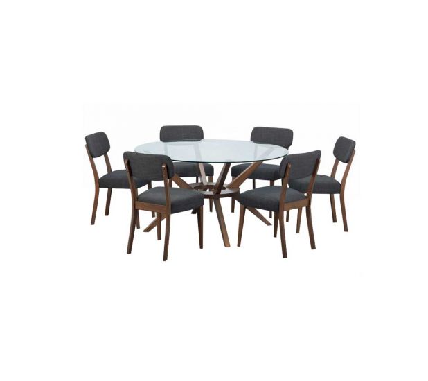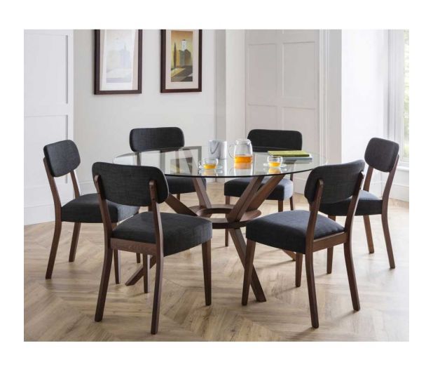A truly stunning 140cm circular dining table featuring an elegantly styled solid wood base in walnut finish, topped with a substantial tempered glass top to create an exquisite contemporay piece that will take pride of place in any home. Featured with 6 Farring dining chairs. Offering hints of retro and Scandinavian designs, the Farring dining chair brings a touch of mid-century sophistication through a fashionable combination of shapes and forms. Upholstered in a grey linen fabric, this dining chair features an open back seat finished with a rich walnut frame.