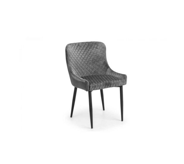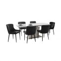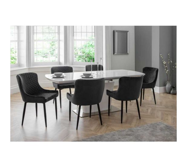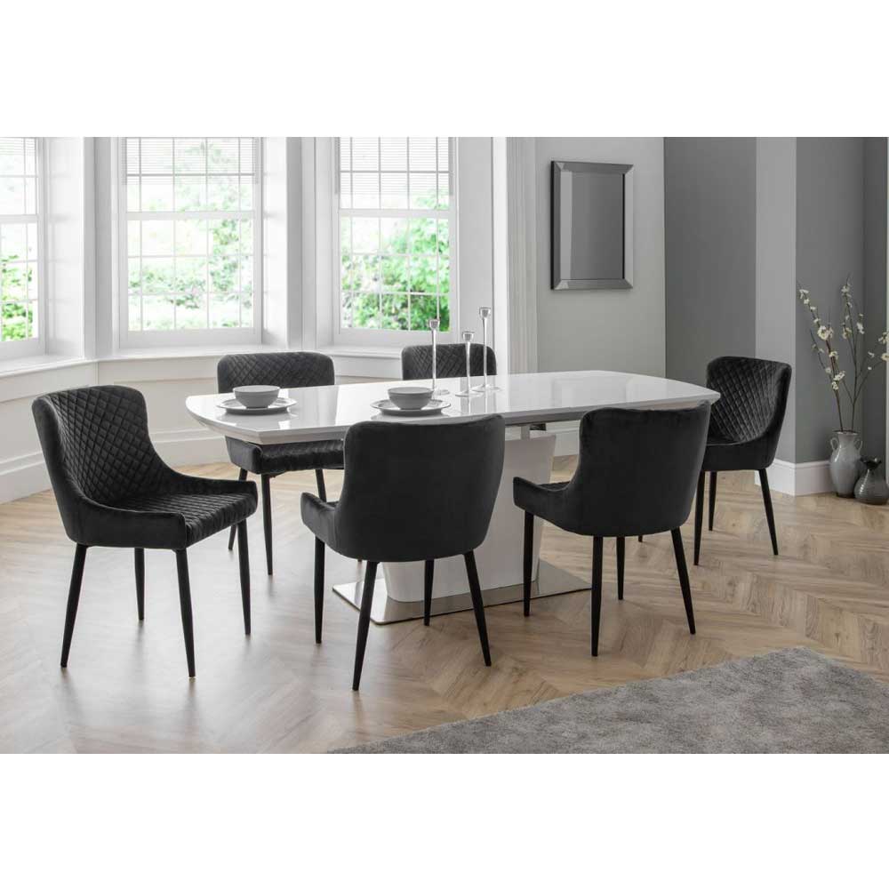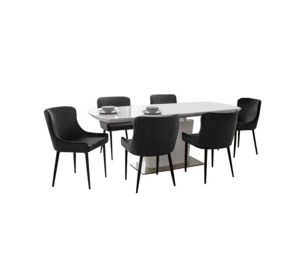 The Como extending dining table is a sleek, modern design finished in a crisp white high gloss with a sturdy chrome pedestal base. This spacious table features a butterfly extension system that is easy to use and stores within the table when not in use, comfortably seating up to 6 people. Combining a classic style with a modern twist, the Como Table is accompanied by 6 Luxe dining chair, beautifully upholstered in a grey velvet fabric with luxurious quilted detailing. Featuring contemporary black painted legs, this dining chair adds a touch of elegance to any dining area.