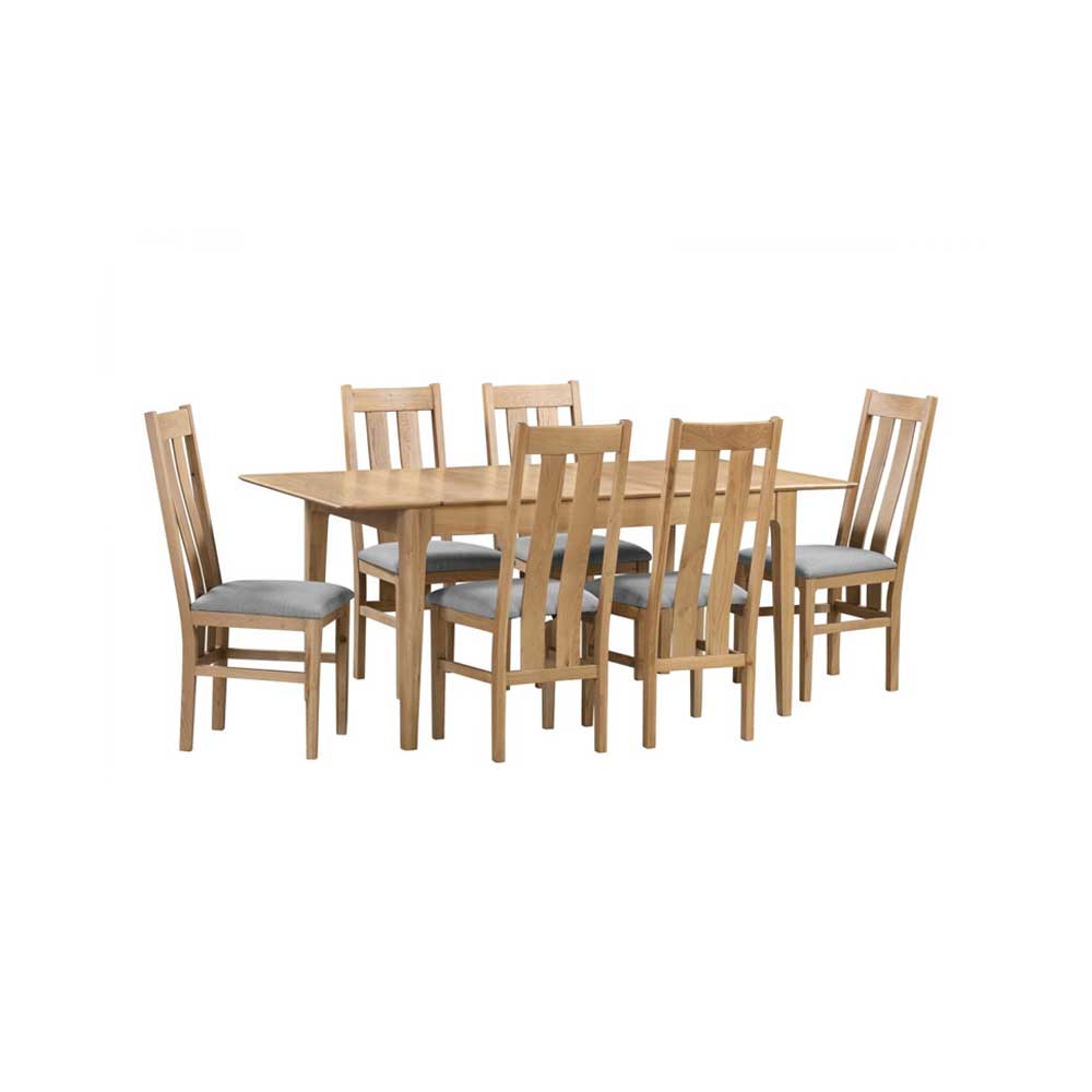 Extending from 140cm to 180cm, the Cotswold Dining Set spaciously seats up to 6 people. Crafted from solid oak and oak veneers, the Cotswold highlights the natural beauty of the wood through the grain creating a traditional style with a clean and simple design.