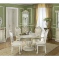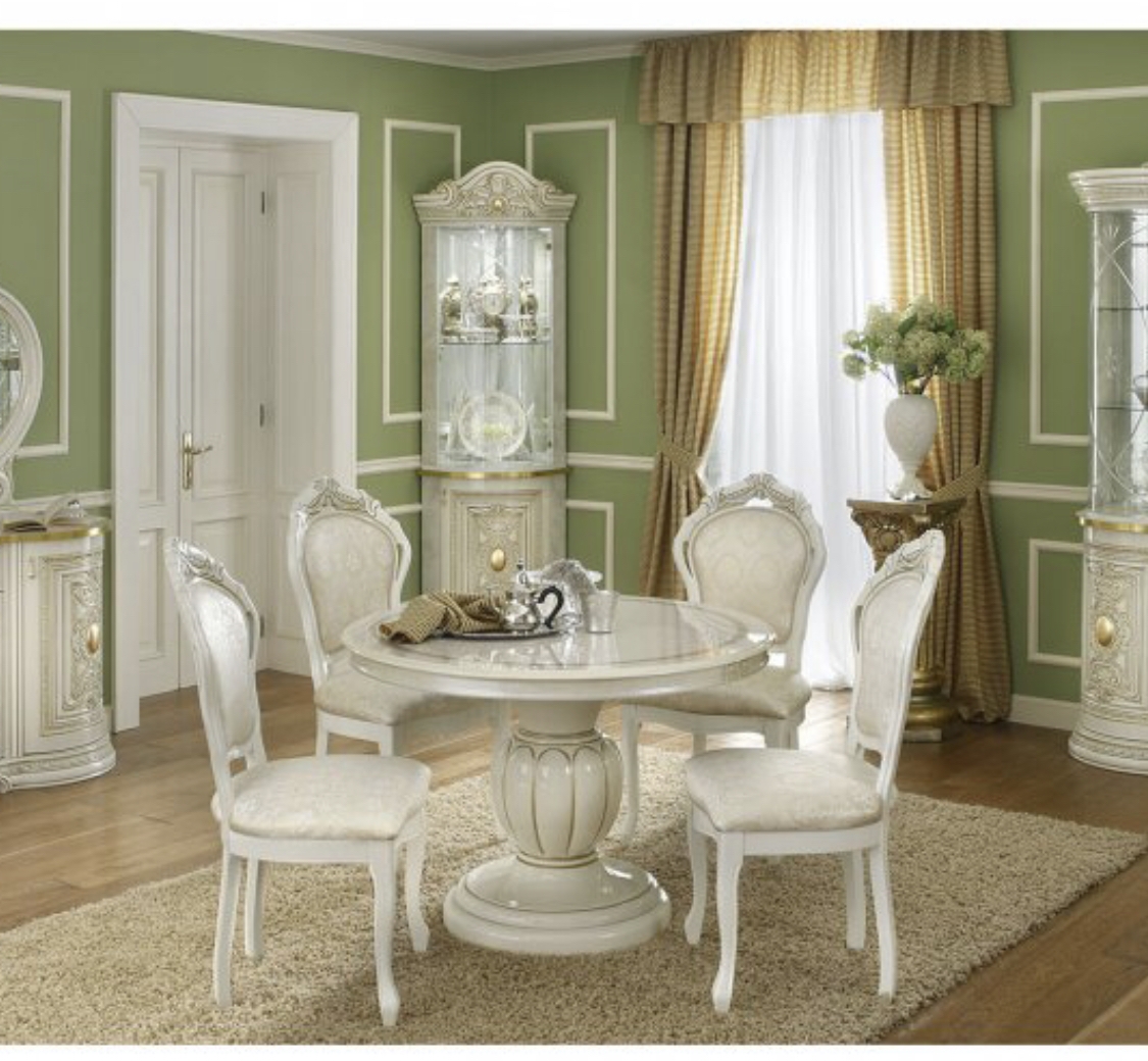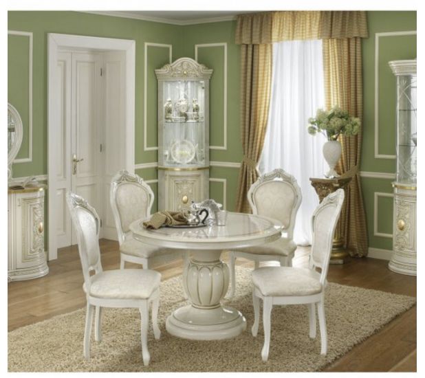 The Dining table features an ivory lacquered top and base with 1 pedestal. It is an extending dining table and can seat up to 6 people. The set offer comprises dining table and 4 dining chairs.