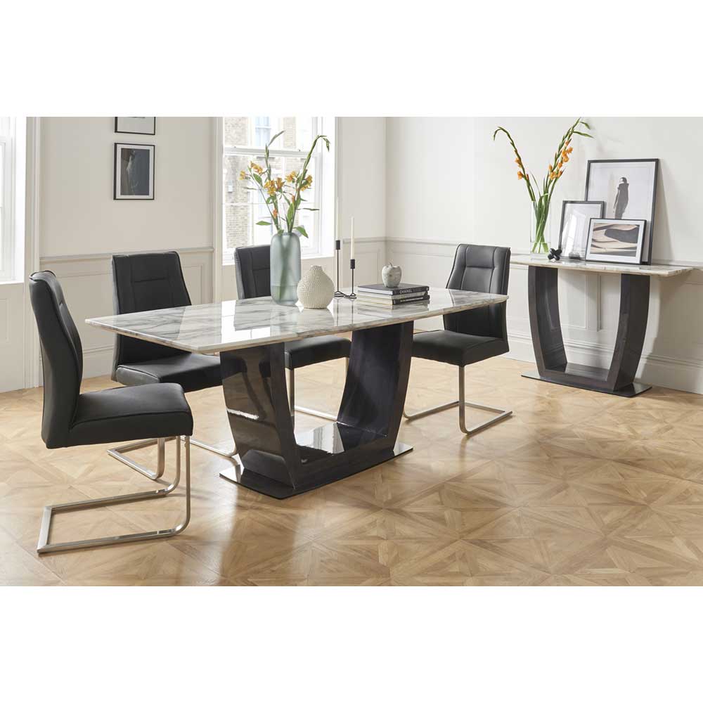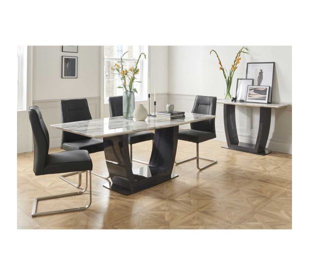The Lucia collection has a contemporary and sophisticated look. This monochromatic design will work with an array of interiors with its curved base and a dark brushed steel base plate perfectly matched with Luciana charcoal dining chairs to ensure comfort while entertaining for many hours. Carry this range throughout your home with the matching occasional pieces.