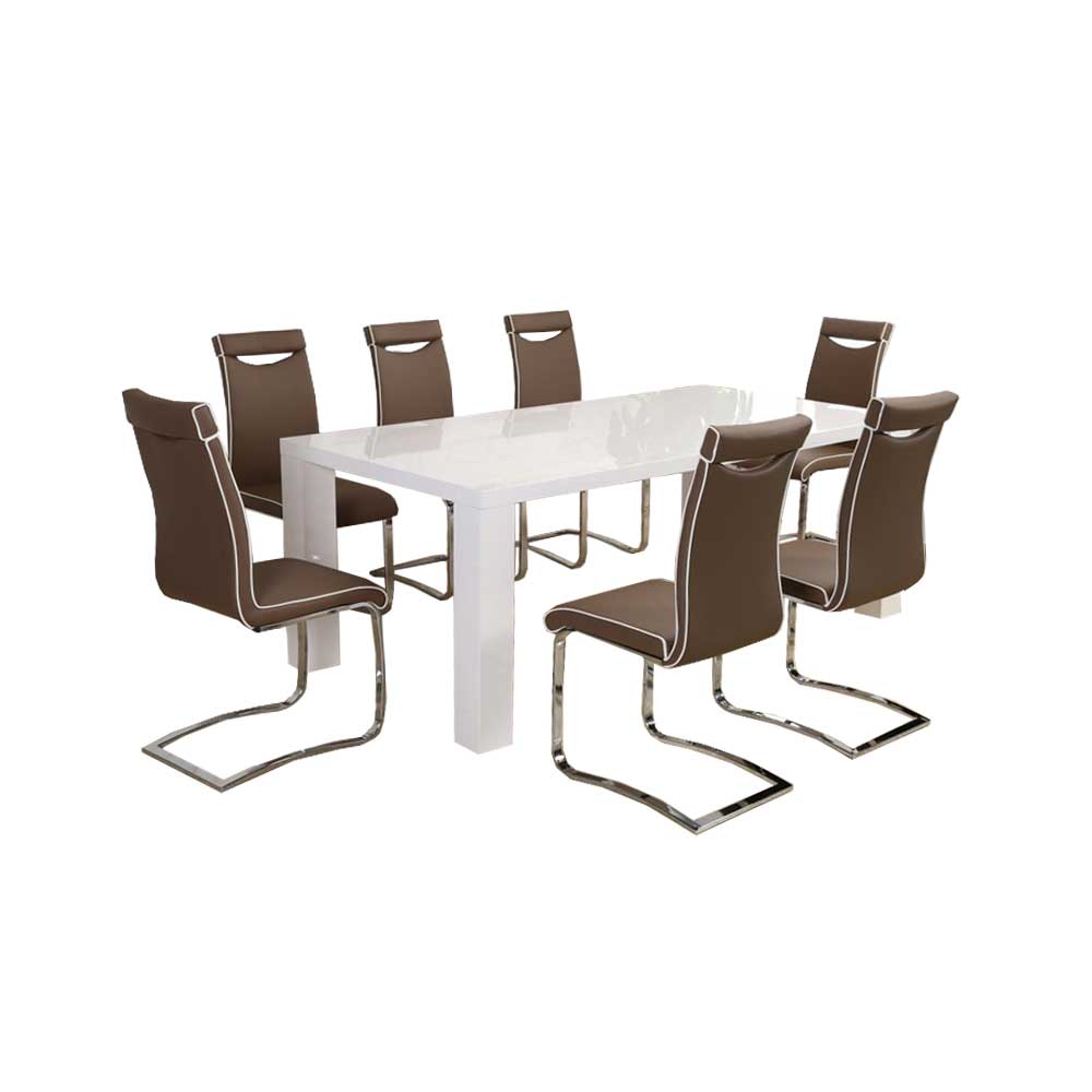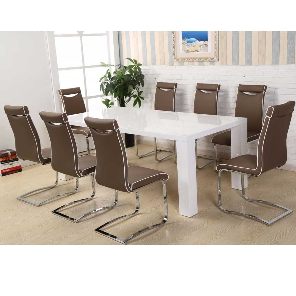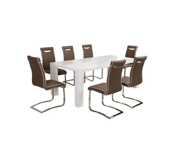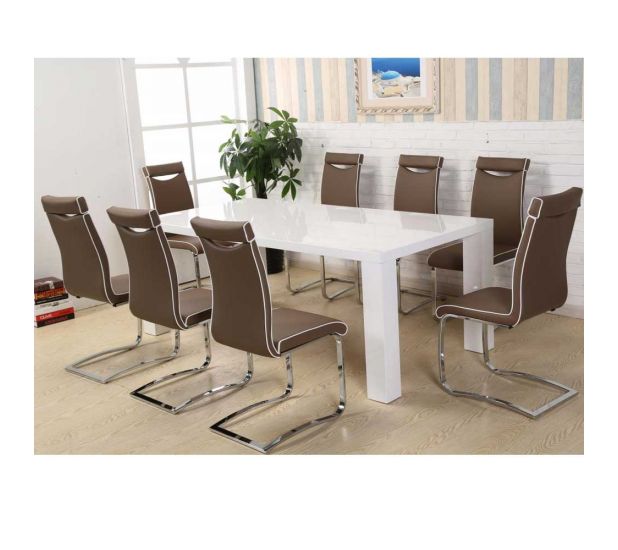 The stunning white high gloss dining set comes with 8 stylish brown PU dining chairs which will add a modern charm and elegance to any room.