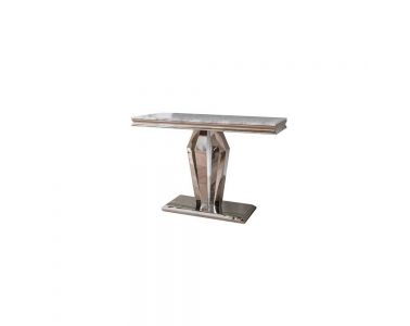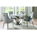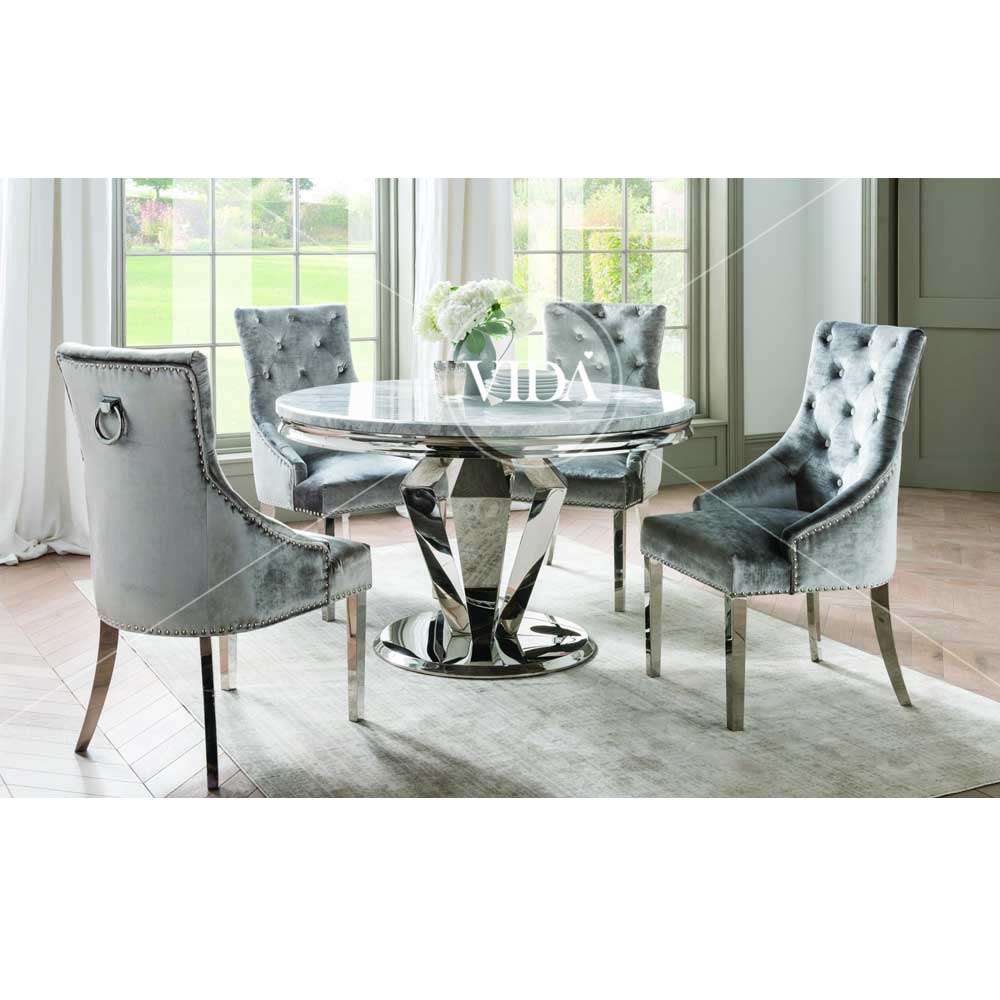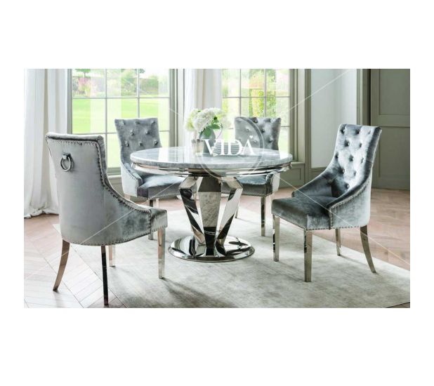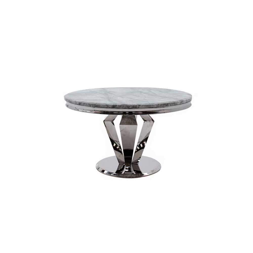 The Art is a contemporary dining collection with billowed stainless steel legs and grey marble top.