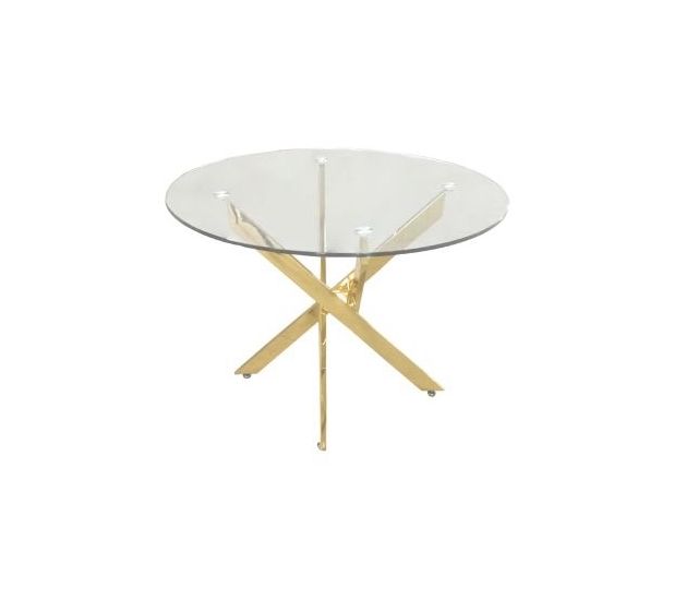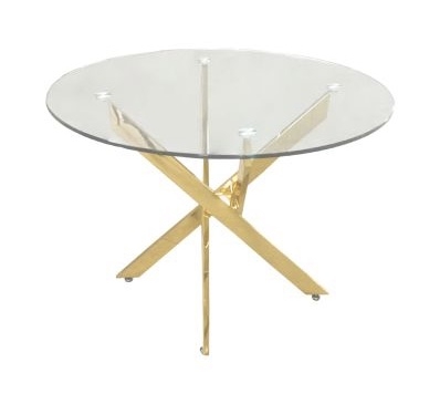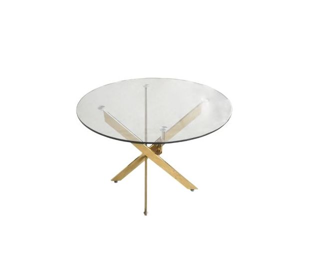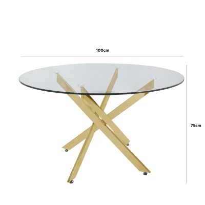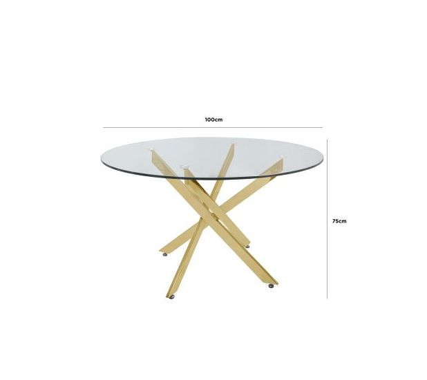 Vena in glass is our most popular contemporary dining collection. The dining table features round glass top and a beautiful gold finish crisscross base. The dining table will suit most modern decor and make a statement furniture piece in your dining room. Add a fresh new look to your dining / breakfast room with the effortlessly sleek Vena dining table.