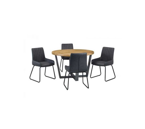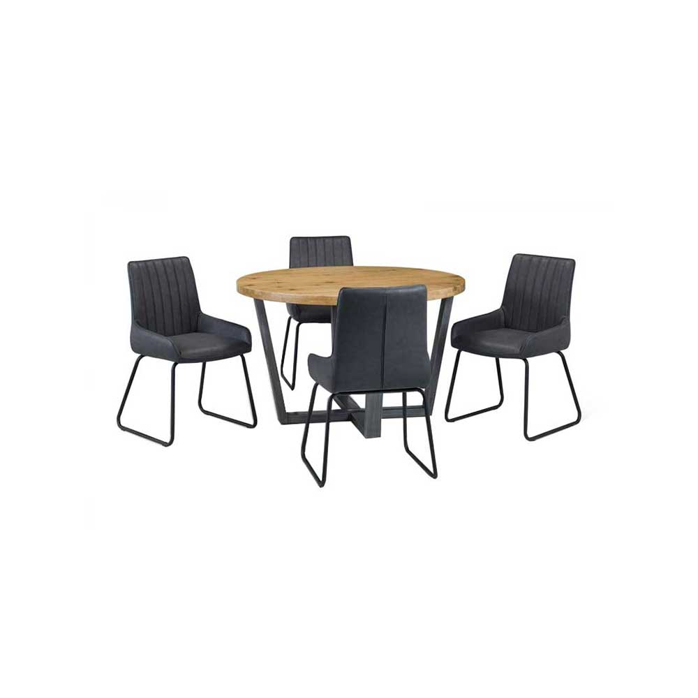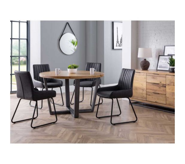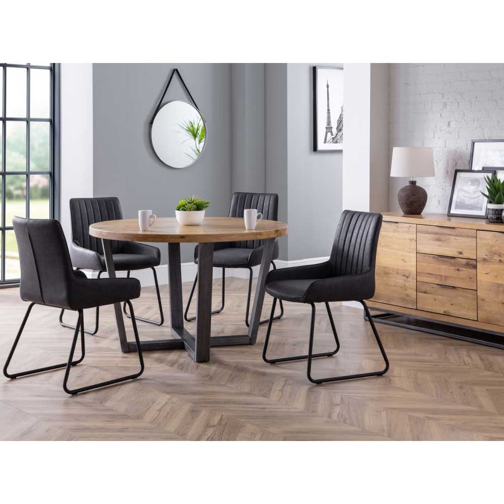 Made from solid oak, this round dining table offers a rustic finish emphasising the stunning natural wood grain. The Brook Round Dining Table offers a vintage edge featuring industrial trestle style metal legs. This spacious table can seat up to 4 people, perfect for a wide range of modern decor. Part of the Brook Dining and Occasional Collection. Accompanied by 4 Soho Dining Chairs. This Retro Soho Dining Chair is finished in an antique black faux leather with a striking black metal frame, sure to compliment any contemporary décor.