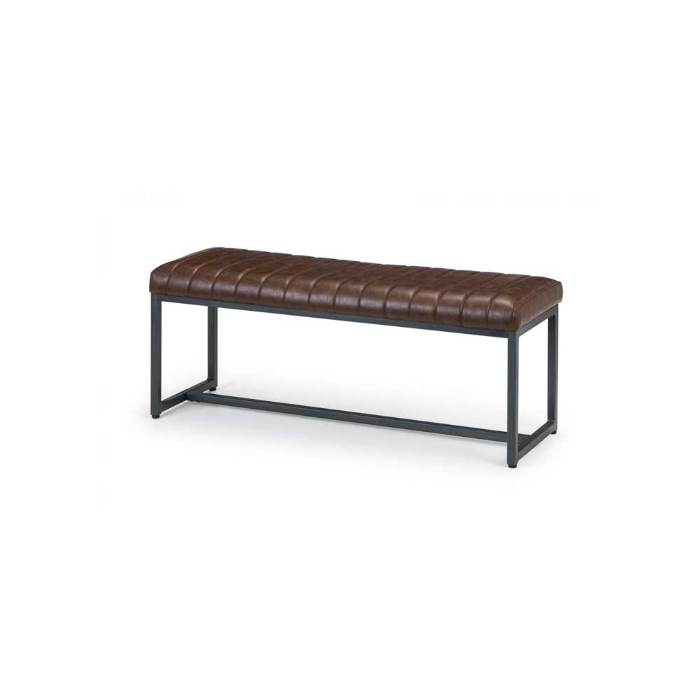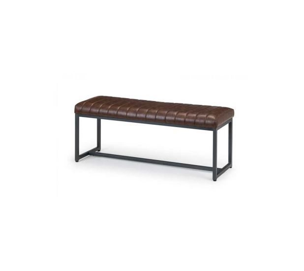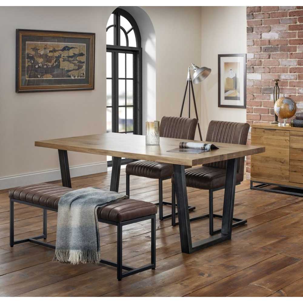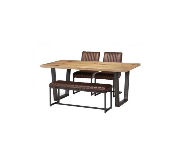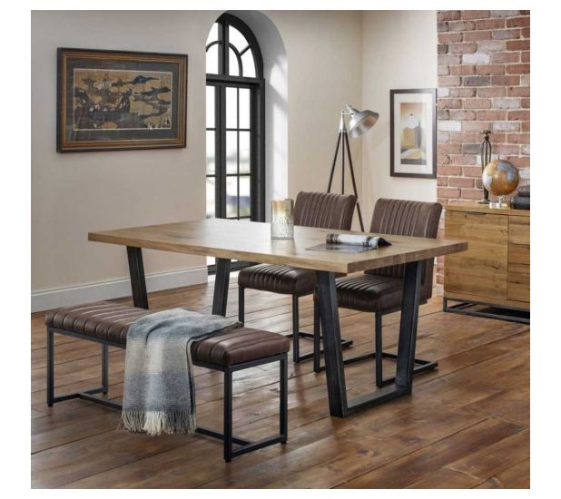 Made from solid oak, this dining table offers a rustic finish emphasising the stunning natural wood grain. The Brook Dining Table offers a vintage edge featuring industrial trapeze style metal legs. This spacious table can seat up to 6 people, perfect for a wide range of modern decor. Featured with the Brook upholstered bench and 2 Brooklyn chairs. Upholstered in a vintage brown faux leather finish, this upholsteresd bench and chairs offer a stunning retro design with a vintage edge featuring industral and cantilever style gunmetal frames. This spacious bench can seat up to 2 people.