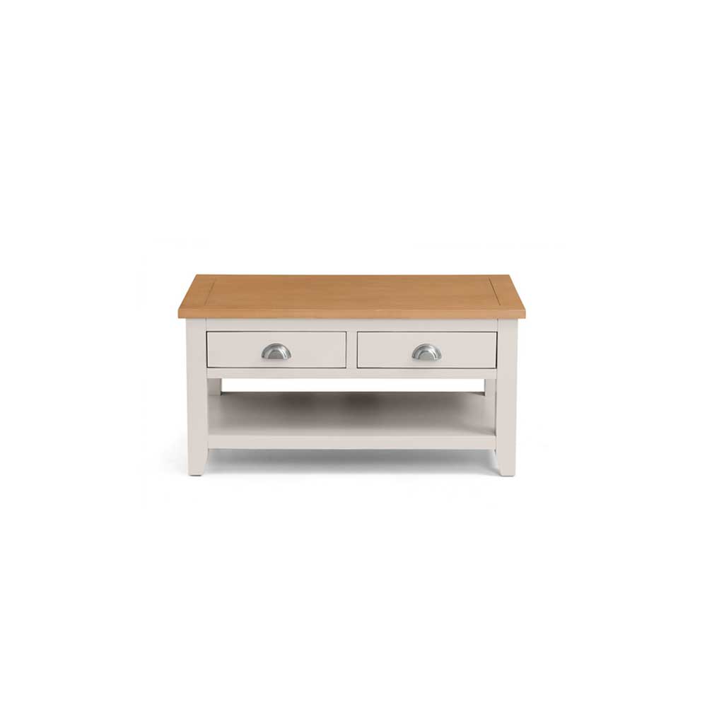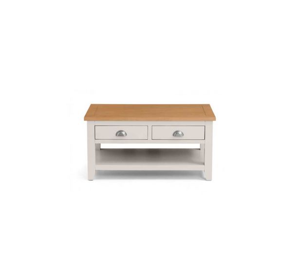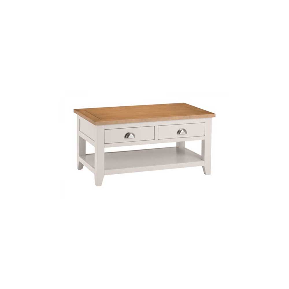 An elegant Coffee Table, presented in an immaculate painted, soft Elephant Grey finish with beautiful pale oak top, crafted from a combination of high grade American White Oak solids and veneers. This stylish piece offers ample storage with 2 large full depth drawers that are accessible from both sides of the table and are accented with chic cupped handles in a brushed steel finish. The combination of superior quality materials and classic design ensures a timeless appeal and fits perfectly alongside both traditional and contemporary decor. Part of the extensive London Dining and Occasional furniture range