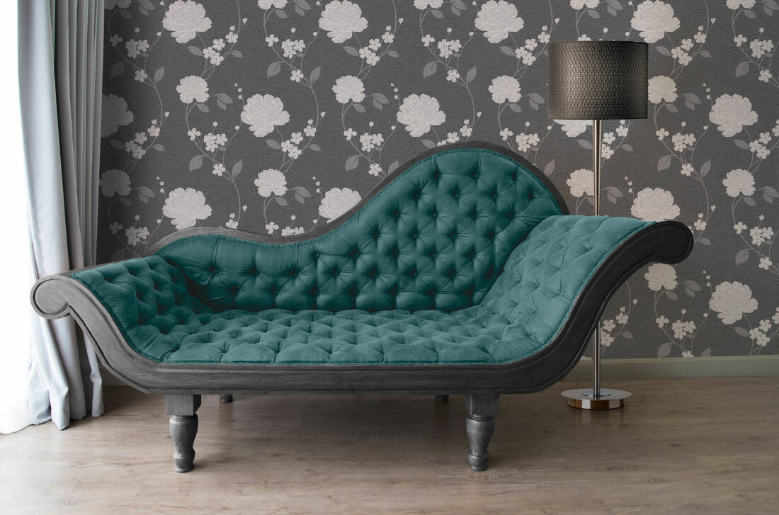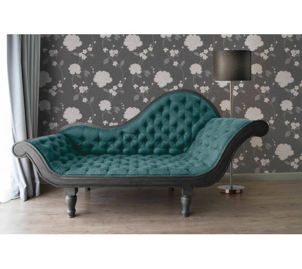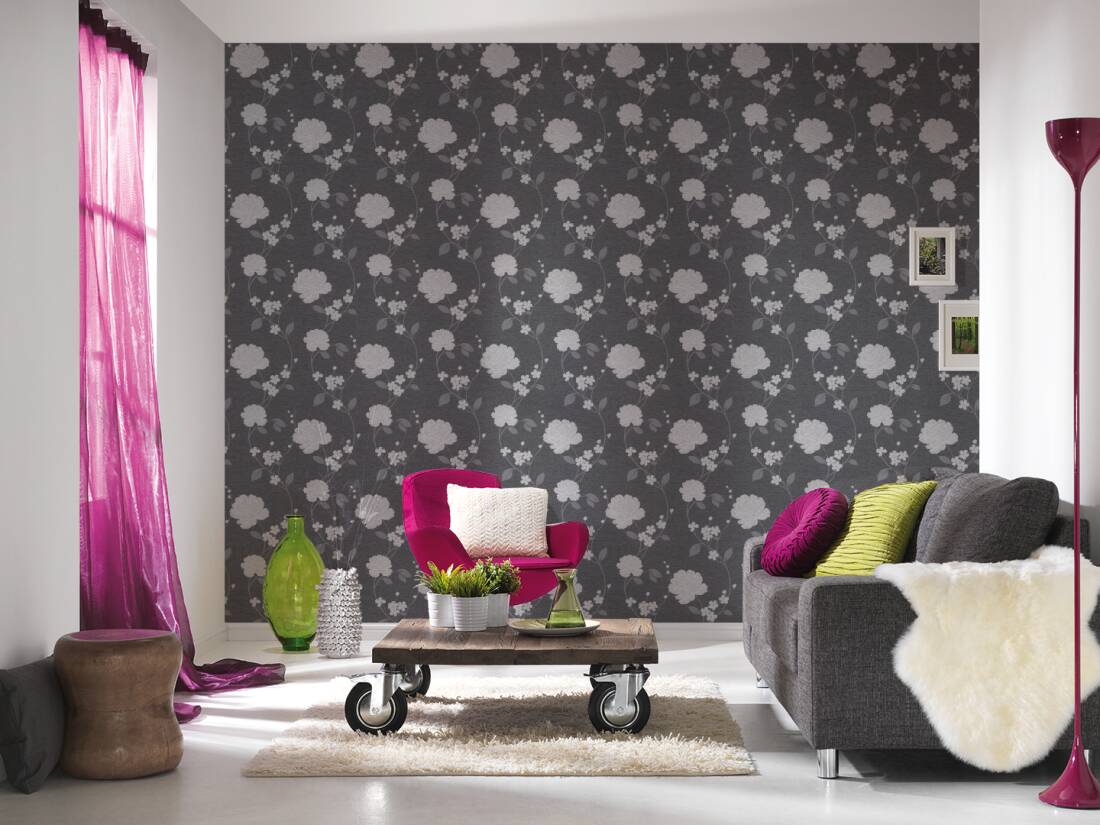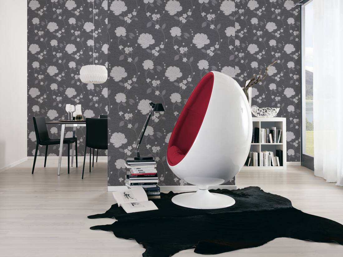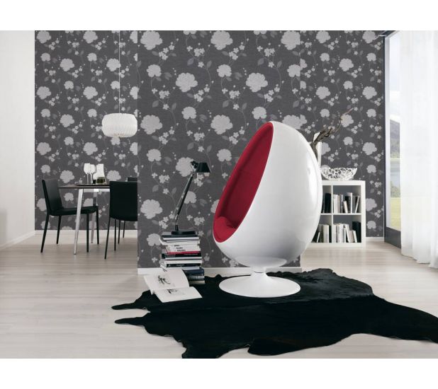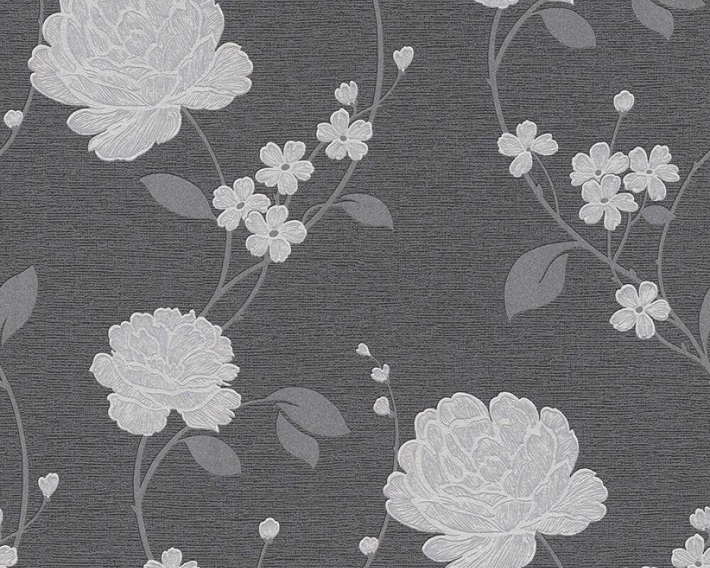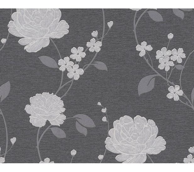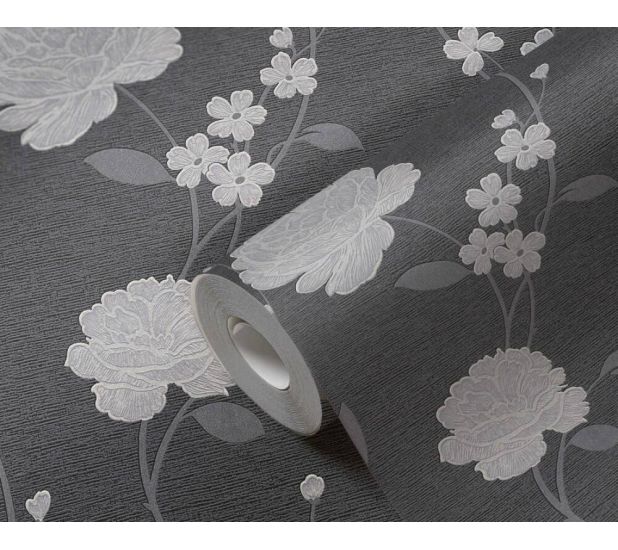 An elegant, bold and modern floral pattern from Adelaide collection by AS Creations, print that will make a statement in your room. The vinyl wallpaper features silver metallic colour ways on charcoal background to create a suttle but dramatic look in your home. Ideal for bedrooms, hallways or lounges.