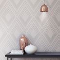 This stylish Alea Geometric Wallpaper would make a great statement in most rooms of your home. The design features a geometric pattern of concentric diamond shapes with a high shine metallic silver finish that catches and reflects the light and dotted detailing.