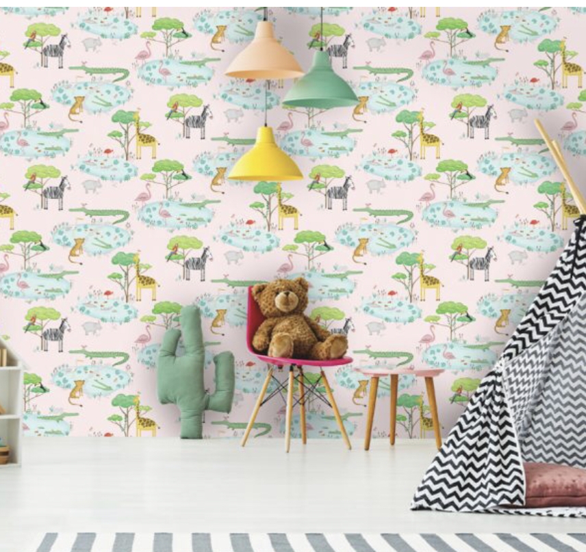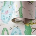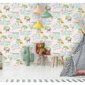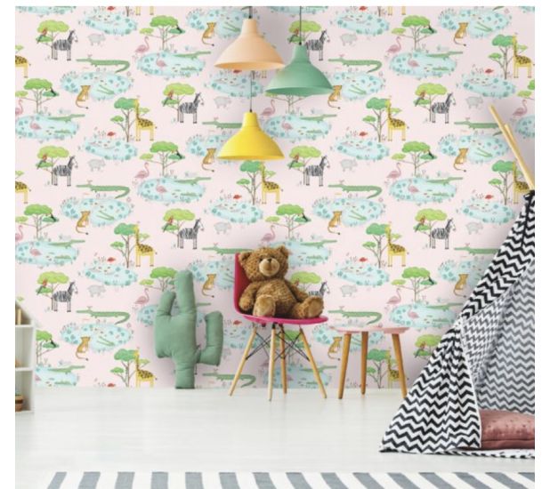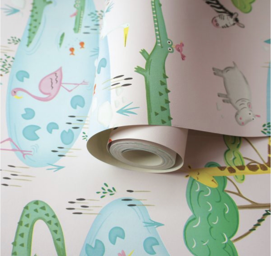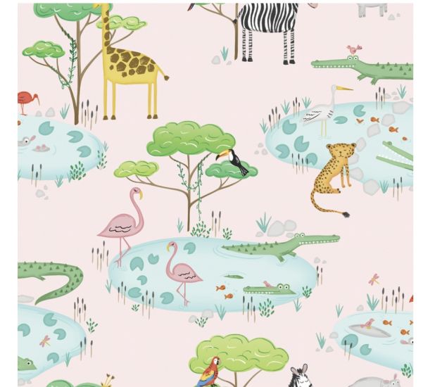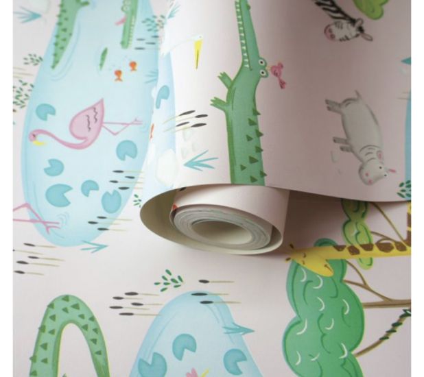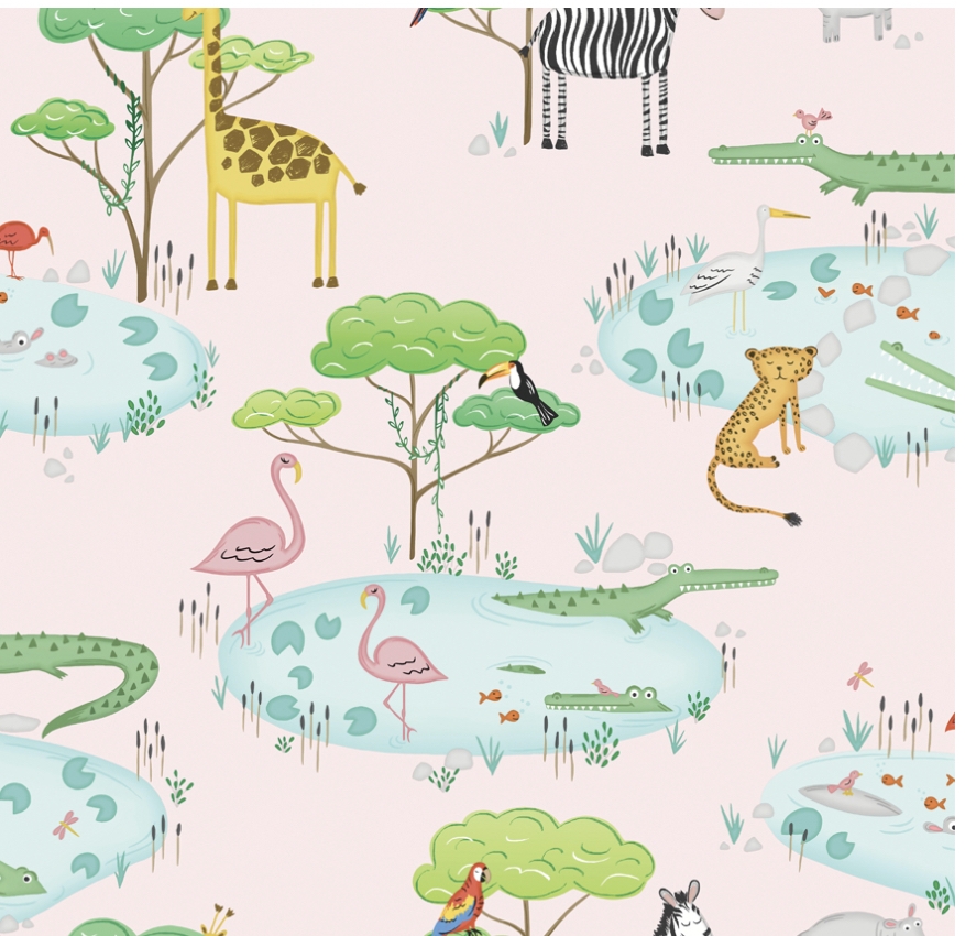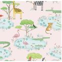 Crocodile lake wallpaper from Over the Rainbow collection by Holden Decor is a jungle animal scene wallpaper that features a lake with hippos, toucans, giraffes, zebras, parrots, flamingos, crocodiles and leopards. Ideal for playrooms and children’s bedrooms.