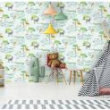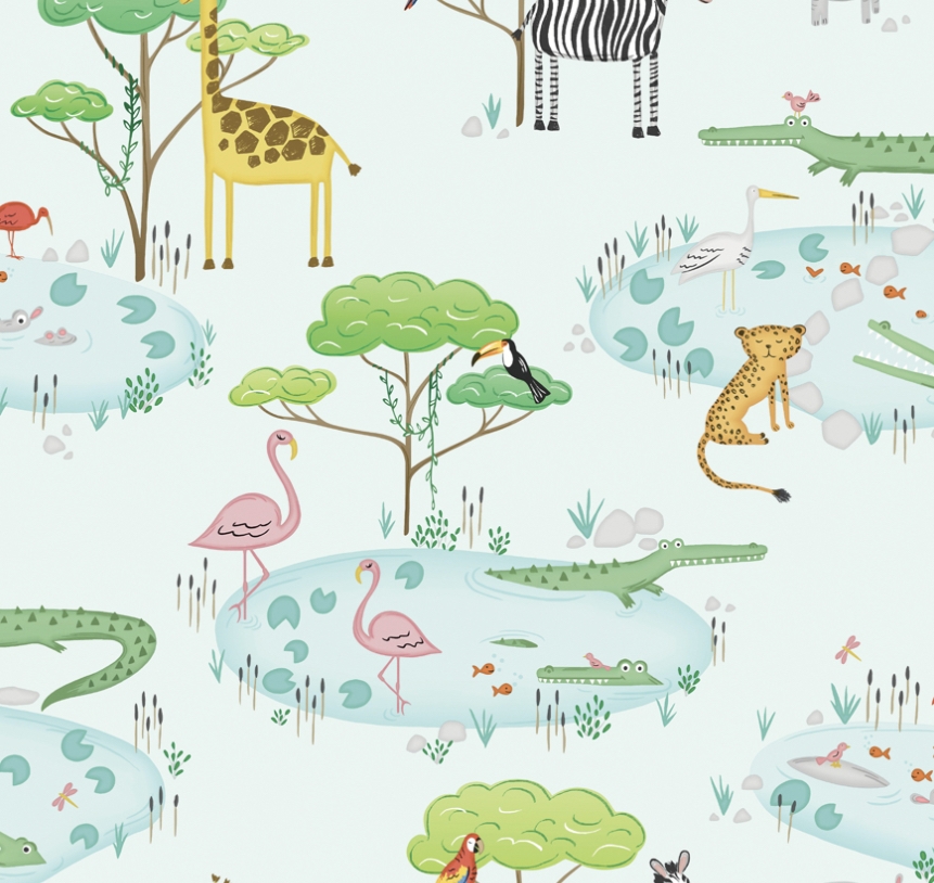 Crocodile lake wallpaper from Over the Rainbow collection by Holden Decor is a jungle animal scene wallpaper that features a lake with hippos, toucans, giraffes, zebras, parrots, flamingos, crocodiles and leopards. Ideal for playrooms and children’s bedrooms.