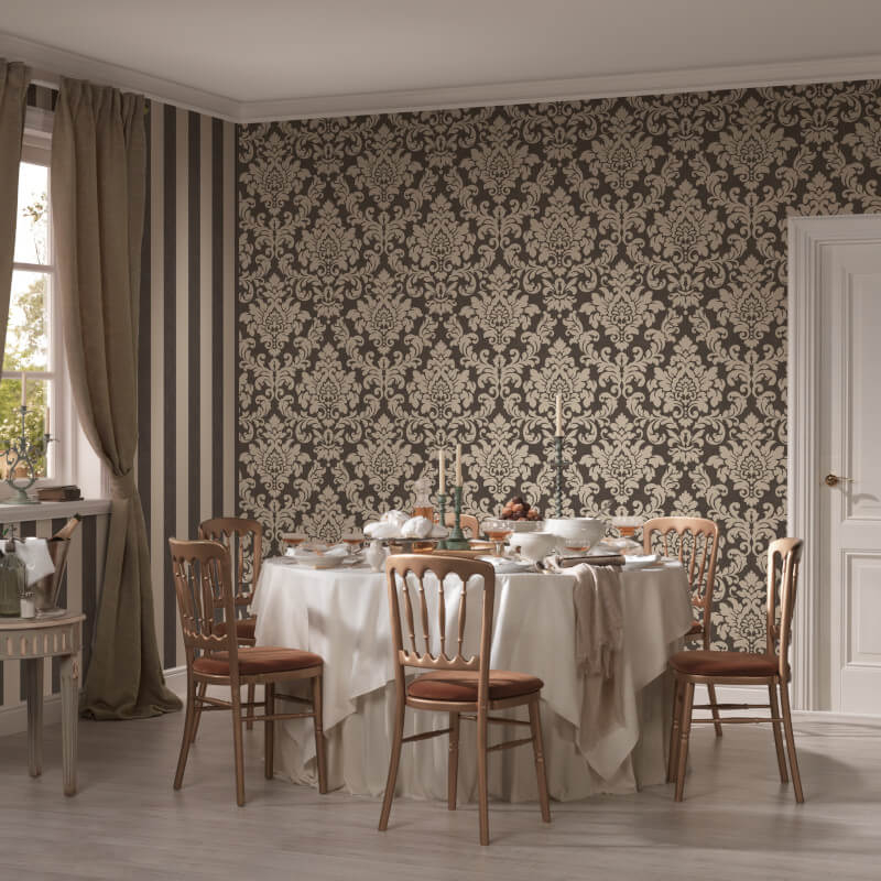 The AS Creation Diamonds Glitter Wallpaper in black and beige is the perfect way to complete classical traditional look in your room. The glitter damask design is perfectly complemented by its glamorous black and gold royal colour palette. The AS Creation Diamonds Glitter Wallpaper can be used to add a touch of sparkle to any living area, bedroom or workspace.