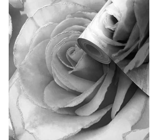 This beautiful Floral Wallpaper is part of glitter Madison Collection by Muriva and will make a stylish addition to your home. The design has soft grey and white roses, grey and white floral trail that forms a diamond pattern. This is set on a pale background with a smooth matte finish. Thousands of glitters shine in day light and look like real dew drops. Easy to apply, this high quality wallpaper will look great when used to decorate a whole room or to create a feature wall.