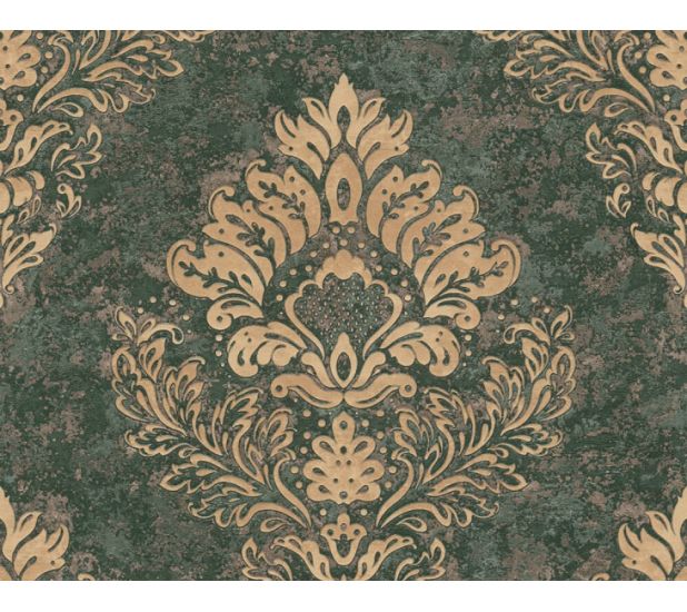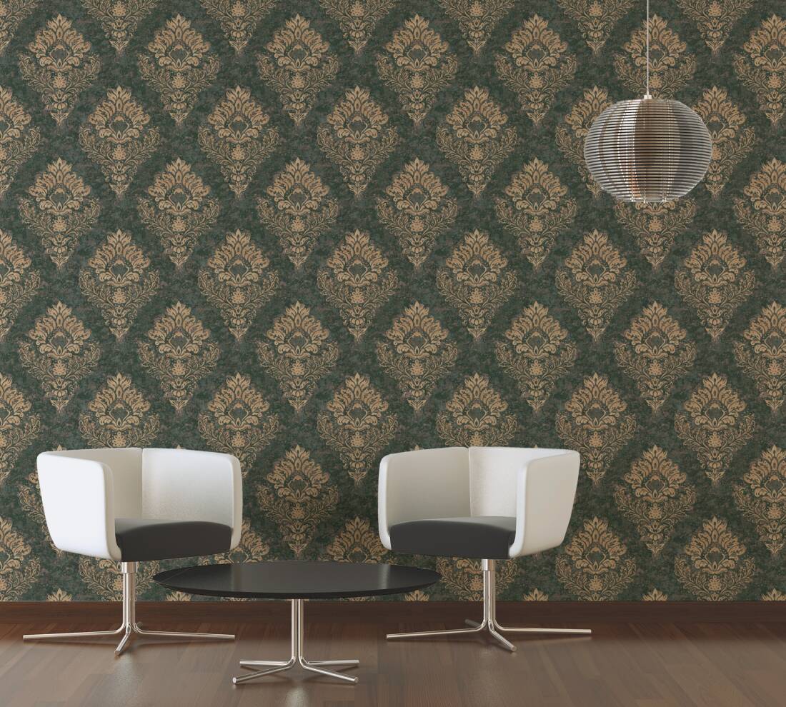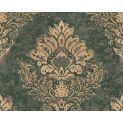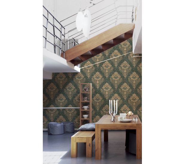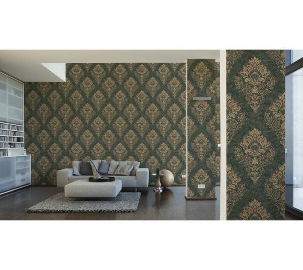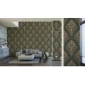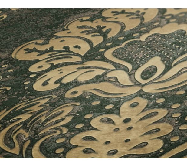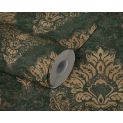 An elegant, royal and ever popular classic Baroque pattern from Metropolitan Stories Living Walls collection by AS Creations, print that will make a statement in your room. The non woven wallpaper features gold motives and floral pattern on green background to create a subtle but dramatic look in your home. Ideal for bedrooms, hallways or lounges.