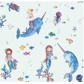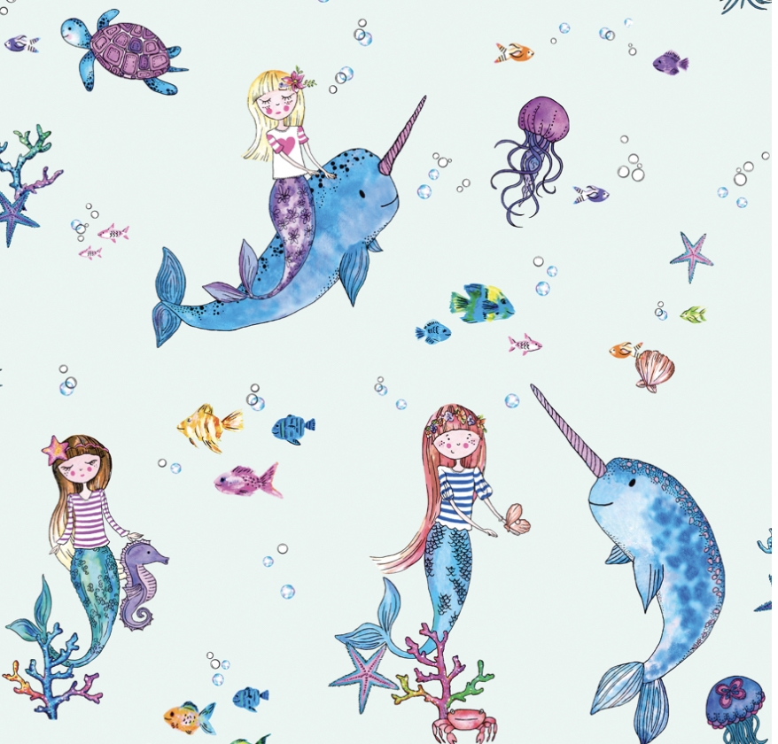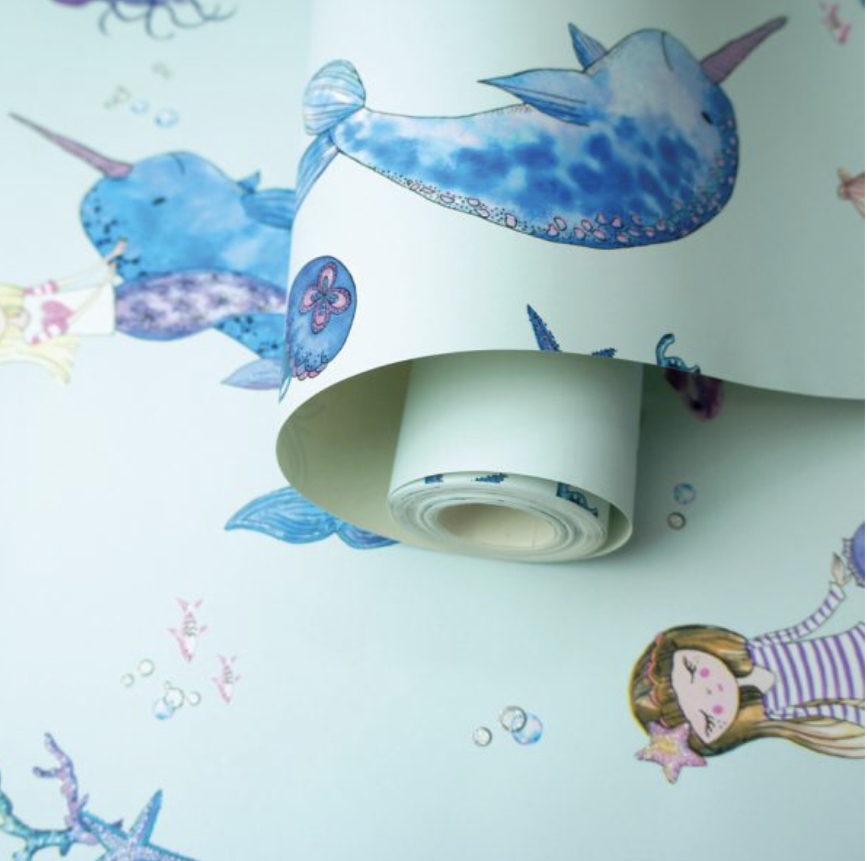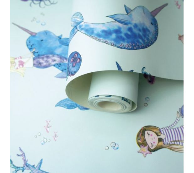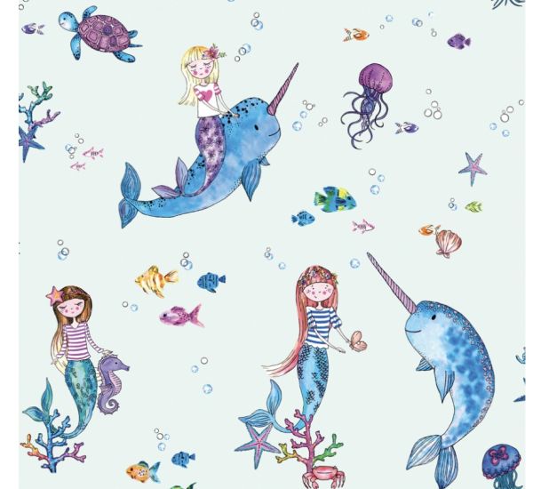 Introducing the Glittery Wallpaper from the Over the Rainbow collection by Holden Decor. This whimsical design features enchanting mermaids, narwhals, fish, starfish, jellyfish, and bubbles, creating a magical atmosphere in playrooms and children's bedrooms.
