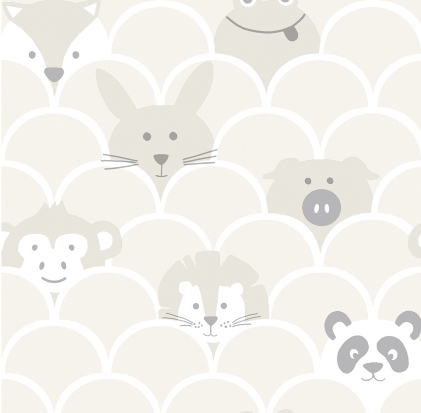 This scallop Peek a Boo wallpaper from Over the Rainbow collection by Holden Decor features lions, pandas, rabbits, pigs, frogs, foxes and monkey heads. Ideal for playrooms and children’s bedrooms.