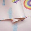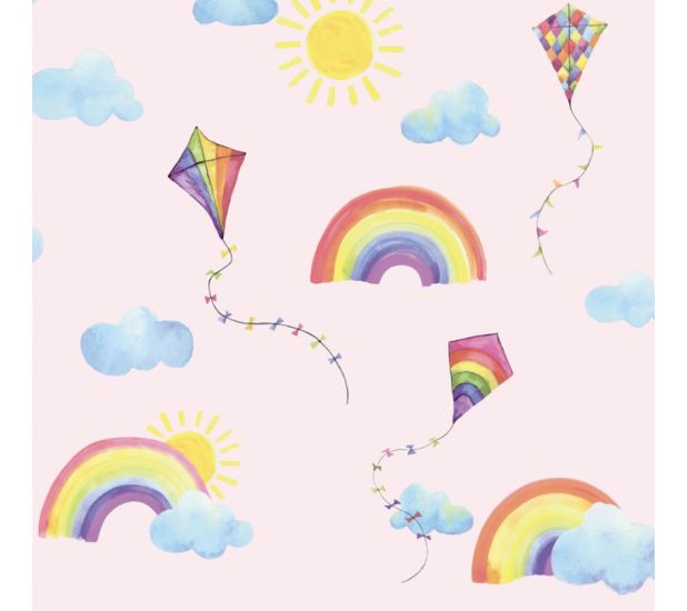 The Rainbows and Kites wallpaper from Over the Rainbow collection by Holden Decor features colourful kites, rainbows, clouds and sunshine. Ideal for playrooms and children’s bedrooms.