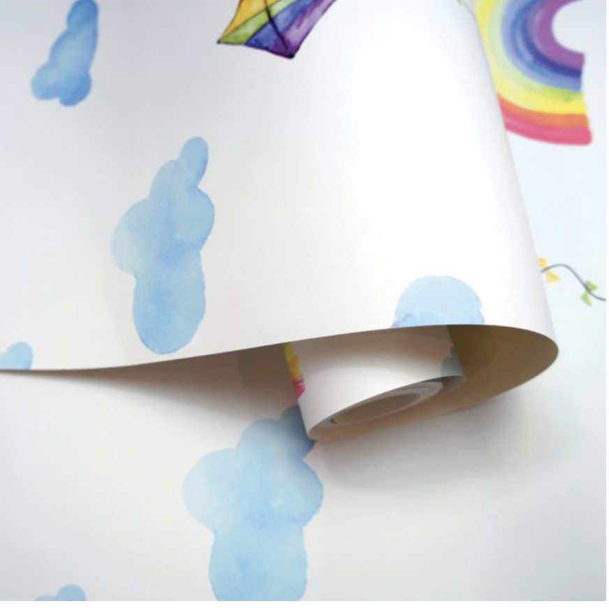 The Rainbows and Kites wallpaper from Over the Rainbow collection by Holden Decor features colourful kites, rainbows, clouds and sunshine. Ideal for playrooms and children’s bedrooms.