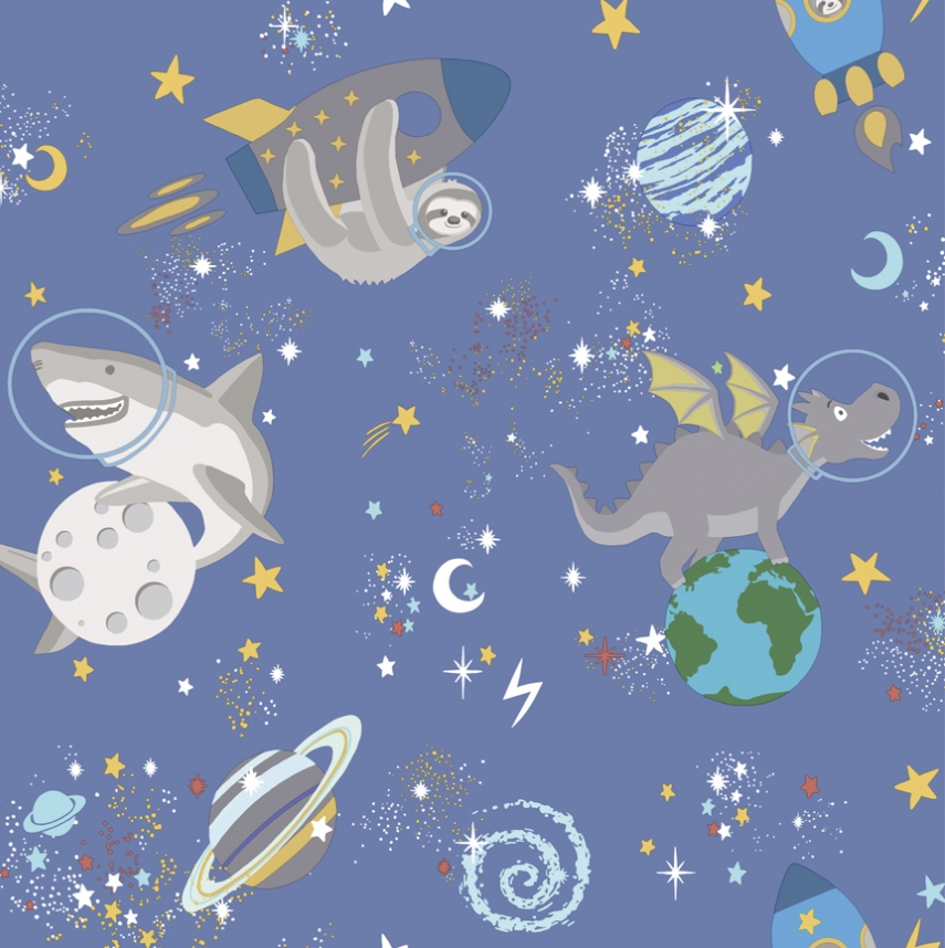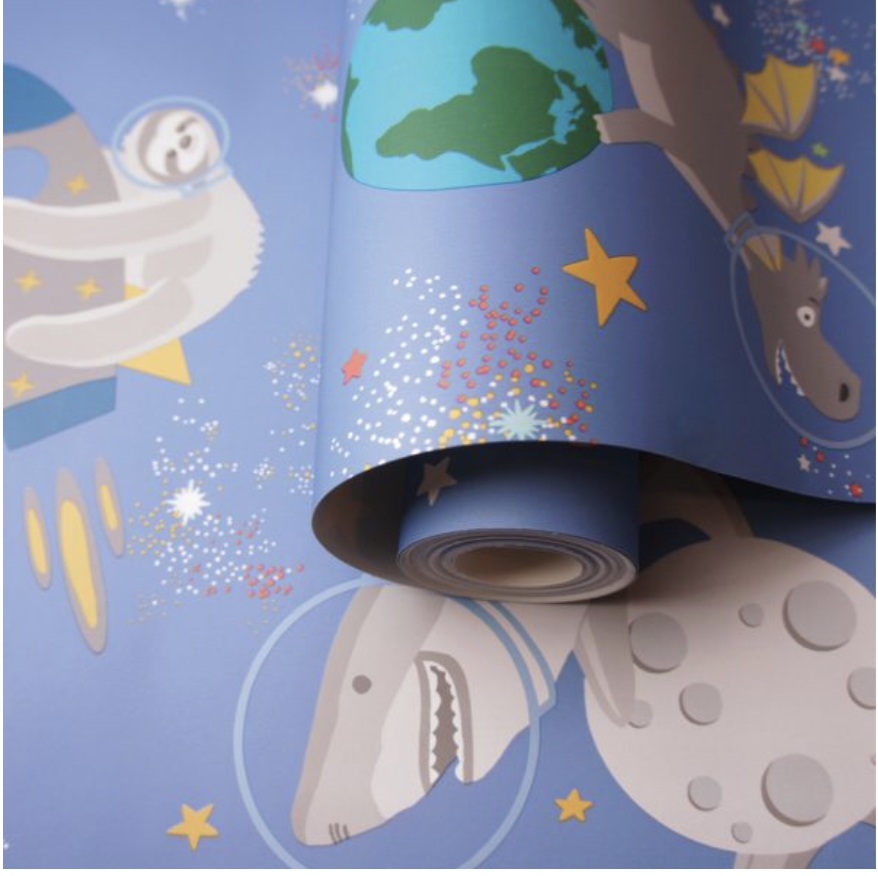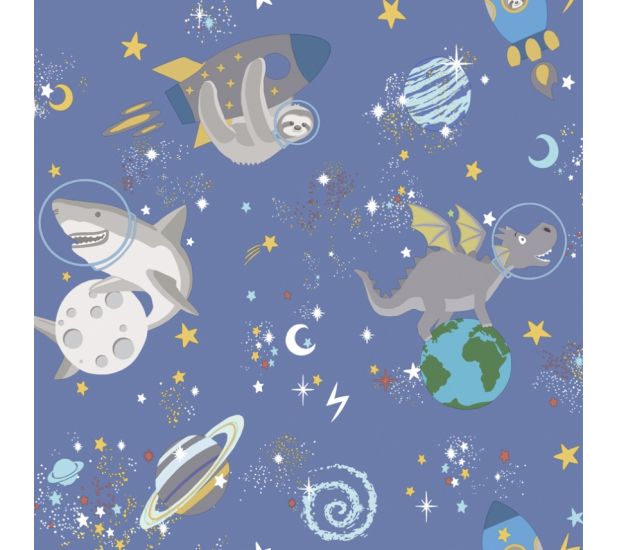 The Space Animals wallpaper from Over the Rainbow collection by Holden Decor is a glow in the dark wallpaper that features creatures like sharks, sloths and dragons on a background of stars, moons and planets. Stars and moons will glow when lights are switched off! Ideal for playrooms and children’s bedrooms.