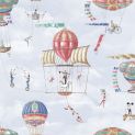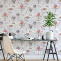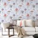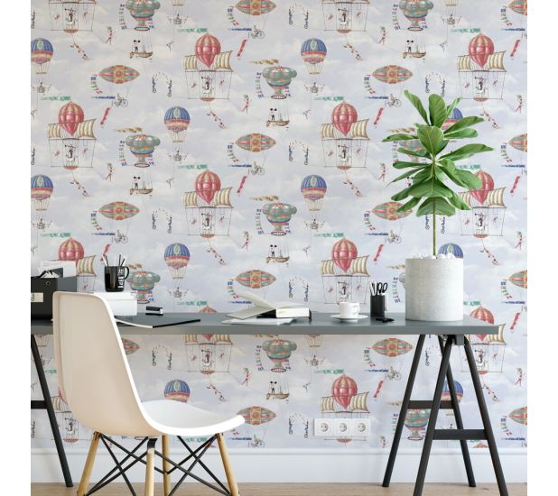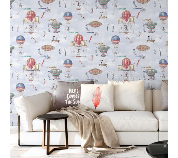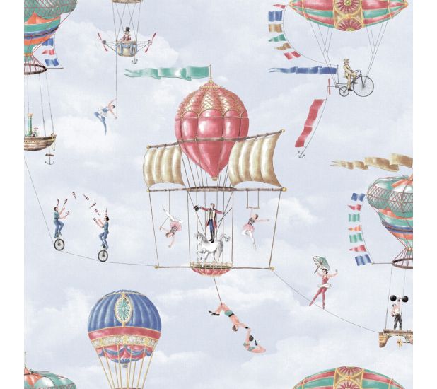 This lively World's Greatest Wallpaper will add a touch of fun to your kids room. The circus themed design features colourful hot air balloons with circus performers including the ringmaster, tightrope walkers, trapeze artists and a strong man. This is set on a pale sky blue background with a faint cloud pattern and a smooth matte finish.