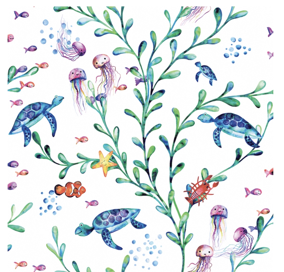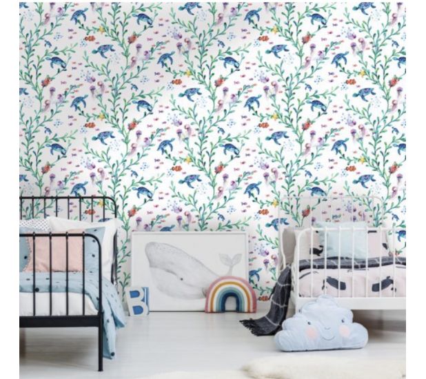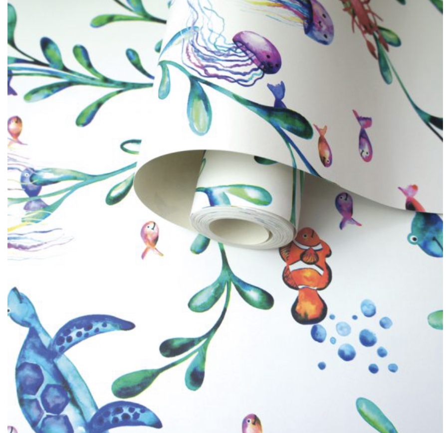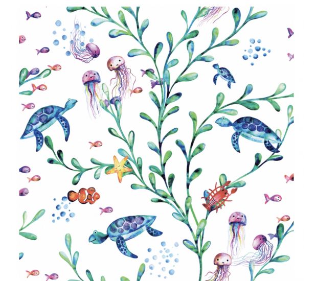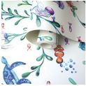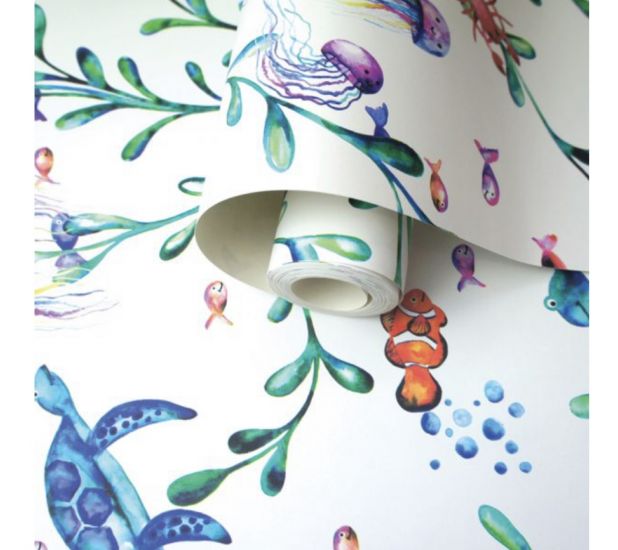 The Under the Sea wallpaper from Over the Rainbow collection by Holden Decor is a Sea themed wallpaper that features a seaweed trail with turtles, starfish, clown fish, jellyfish, fish and lobsters and bubbles. Ideal for playrooms and children’s bedrooms.