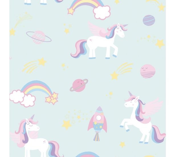 The Unicorns, Rockets and Rainbows wallpaper from Over the Rainbow collection by Holden Decor is a gorgeous glittery wallpaper features unicorns, rockets, rainbows, planets, stars and clouds. Ideal for playrooms and children’s bedrooms.