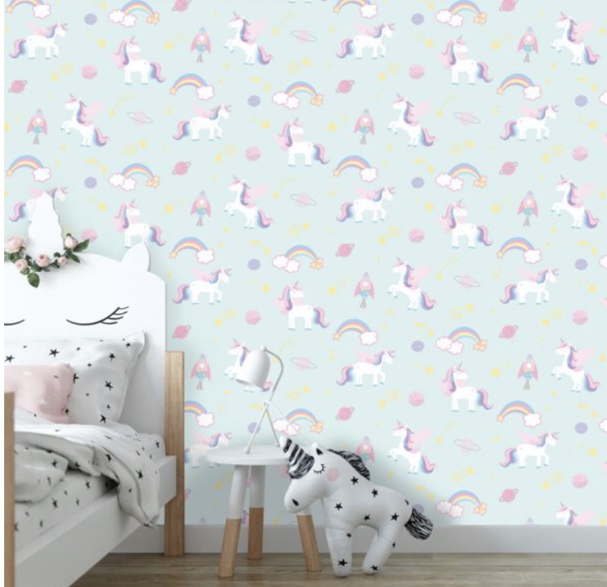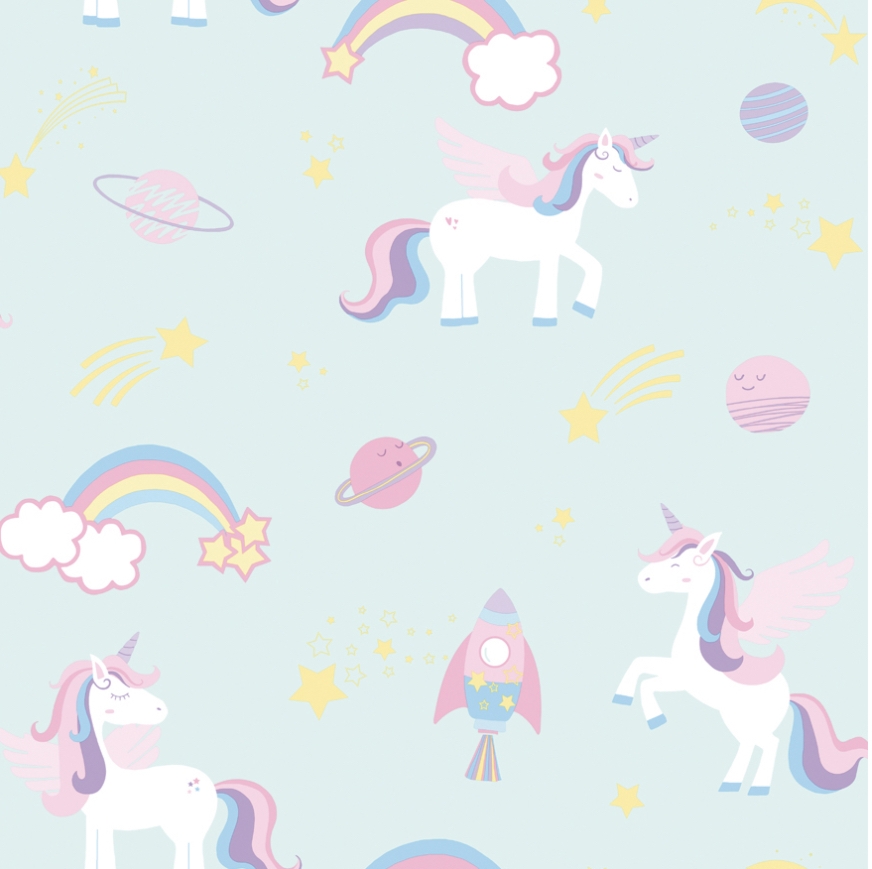 Unicorns, Rockets & Rainbows Wallpaper- Teal