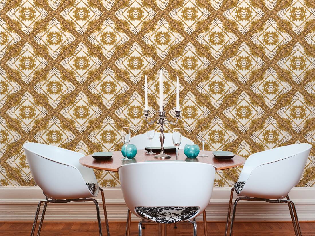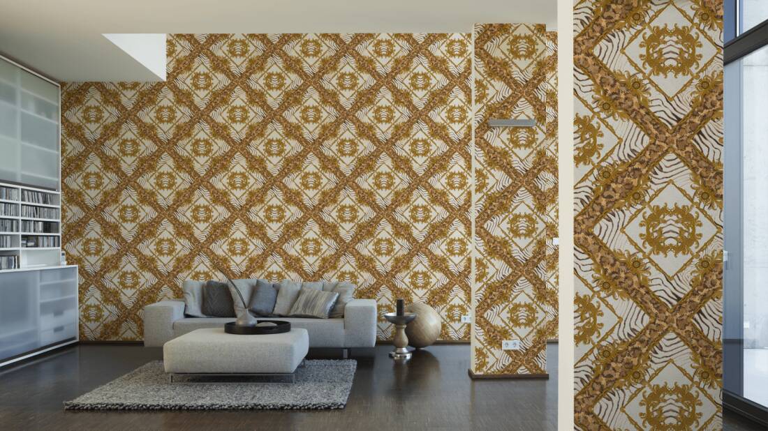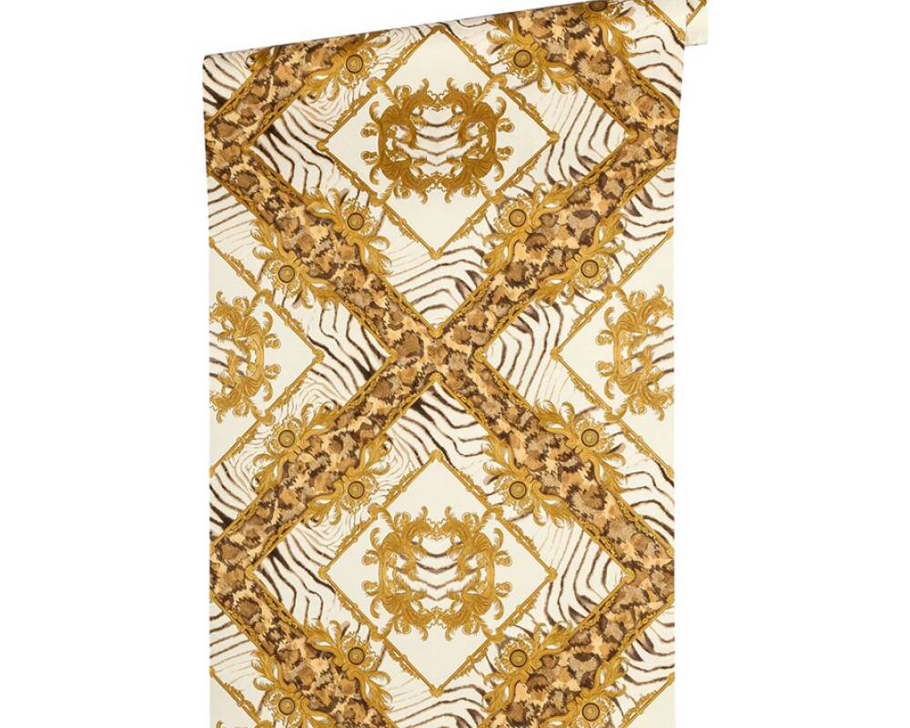 An elegant, bold and ever popular classic Versace print that will make a statement in your room. The wallpaper features brown, gold, and cream contrasting colour ways to create a suttle but dramatic look in your home. Ideal for bedrooms, hallways or lounges. This wallpaper is available in 4 colours.